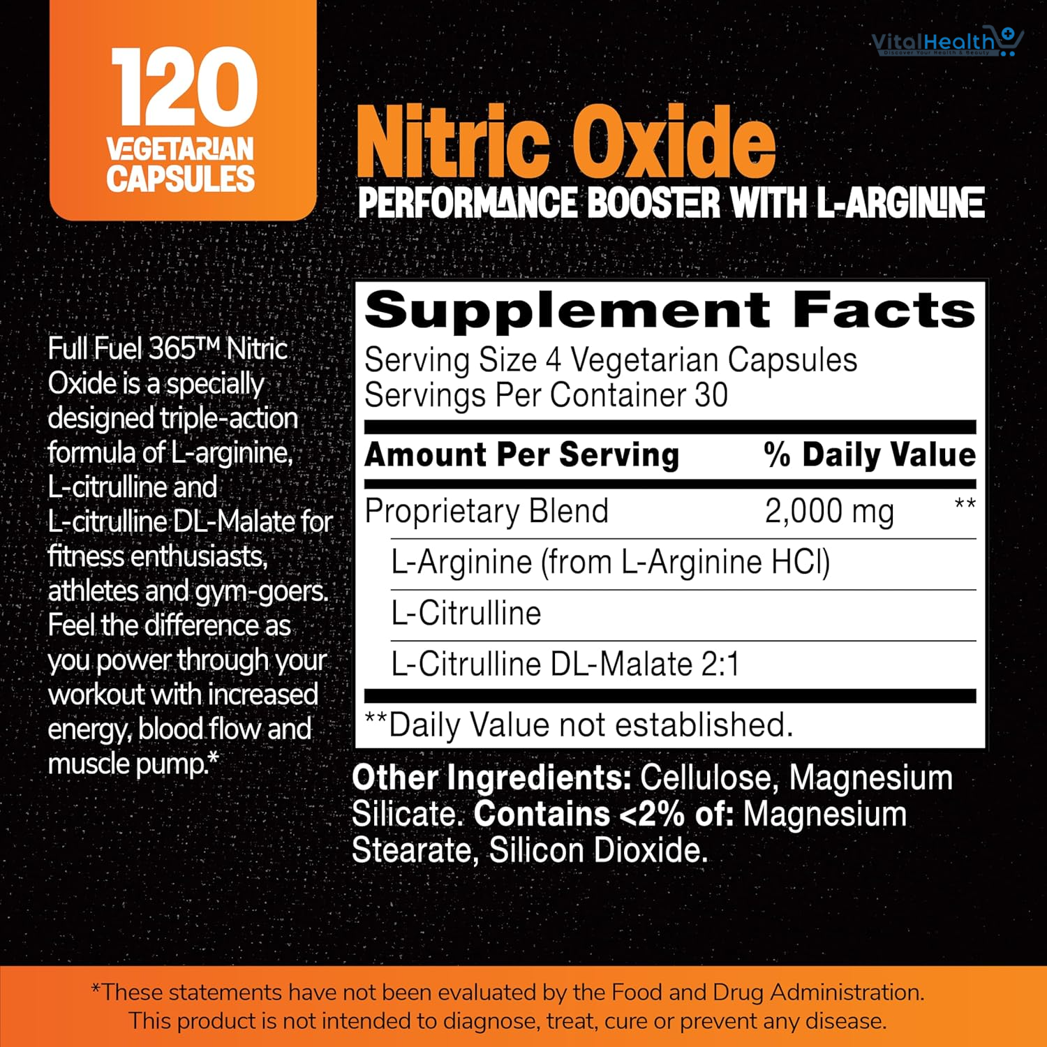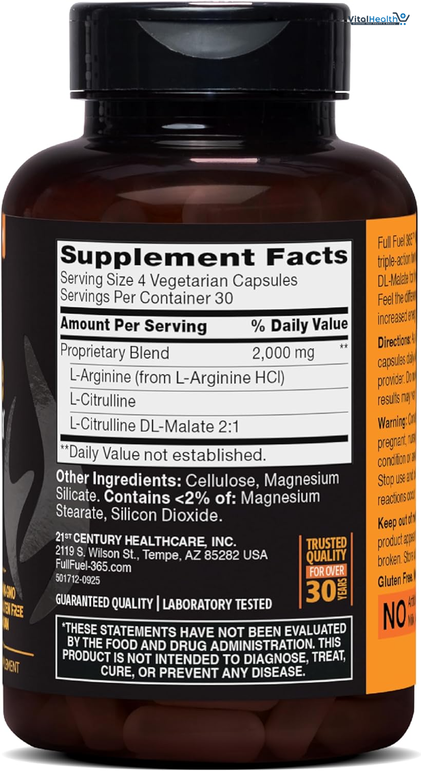 L-Arginine (from L-Arginine Hydrochloride), L-Citrulline, L-Citrulline DL-Malate 2:1, Cellulose, magnesium silicate. Contains <2% of: magnesium stearate, silicon dioxide