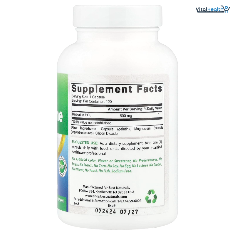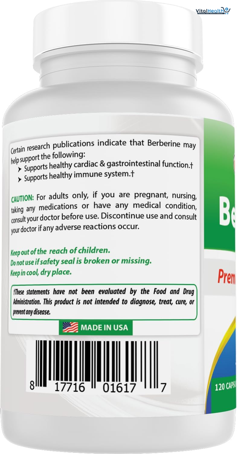 Best Naturals Berberine 500mg supports daily wellness with a potent 5:1 authentic root extract from Berberis aristata and delivers nutritional support. This vegan supplement offers herbal wellness and adaptogenic support with botanical properties, making it ideal for those living a plant-based lifestyle. Each serving of these vegetarian capsules provides rich antioxidant, alkaloid, and adaptogenic properties for daily health needs. This natural supplement may help with weight loss, lower blood sugar and protect your heart.