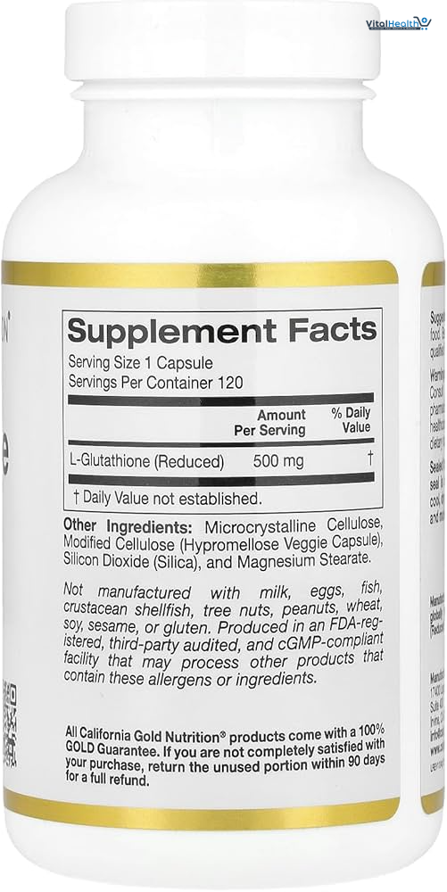 Taking L-glutathione as a supplement can help support healthy detoxification processes, can help protect the cells from free radical damage, and can help maintain cellular health and support overall immune function. The reduced form is a more active form of the antioxidant and has been studied for its increased bioavailability. California Gold Nutrition L-Glutathione (Reduced) contains a reduced form of L-glutathione in veggie capsules. When taken as directed, this provides a 4-month supply.