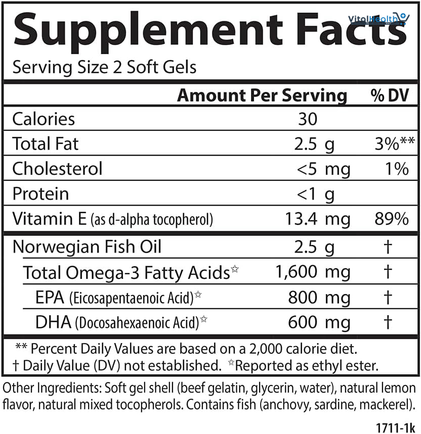 Vitamin E (as d-alpha tocopherol) 13.4 mg, Norwegian Fish Oil 2.5 g, Total Omega-3 Fatty Acids 1,600 mg, EPA (Eicosapentaenoic Acid) 800 mg, DHA (Docosahexaenoic Acid) 600 mg, Soft gel shell (beef gelatine, glycerine, water), natural lemon flavour, natural mixed tocopherols. Contains fish (anchovy, sardine, mackerel).