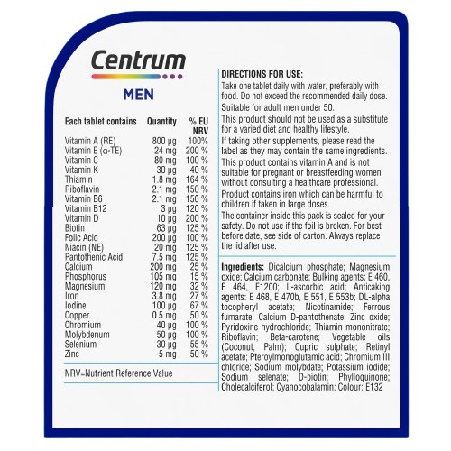 It's simple to take Centrum Men Multivitamin. For optimal nutrient support and energy throughout the day it is advised to take one tablet daily with a meal ideally in the morning. To avoid any stomach pain swallow the tablet with water and do not take it on an empty stomach.