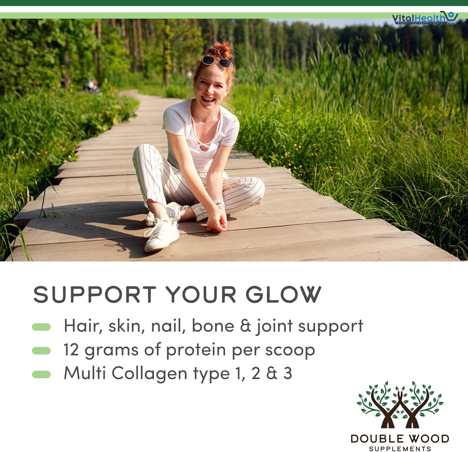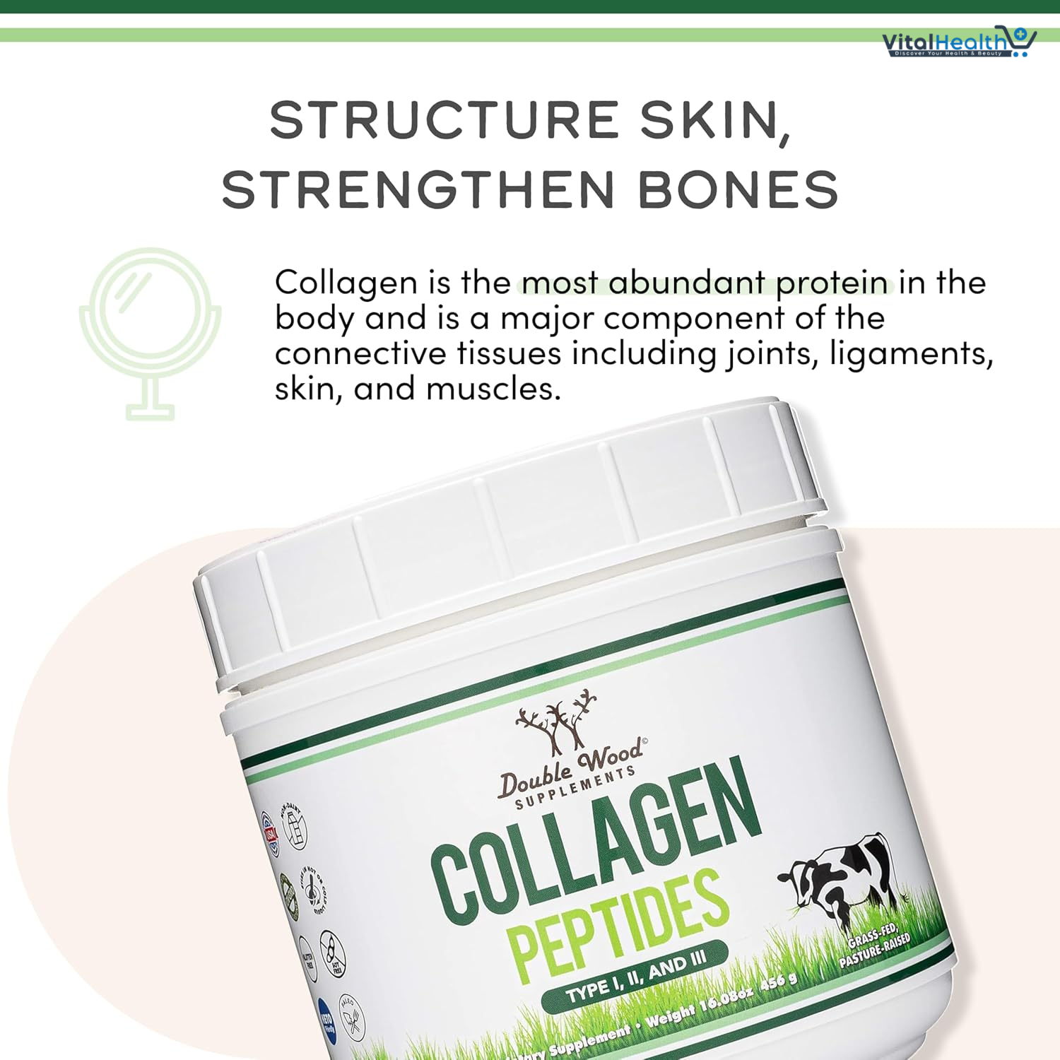 Collagen is the most abundant protein in the body and is a major component of the connective tissues found in numerous body parts including joints, ligaments, skin, and muscles. Collagen has numerous functions in the body such as helping to structure skin and strengthen bones. Collagen is often used as a supplement as it may help support hair, nails, and skin health.