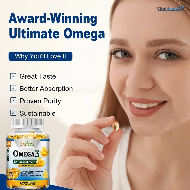 Use the Daitea Omega-3 Fish Oil Capsules to improve your general health and wellbeing. These supplements are essential to your daily regimen regardless of your goals—heart health brain function or radiant skin.