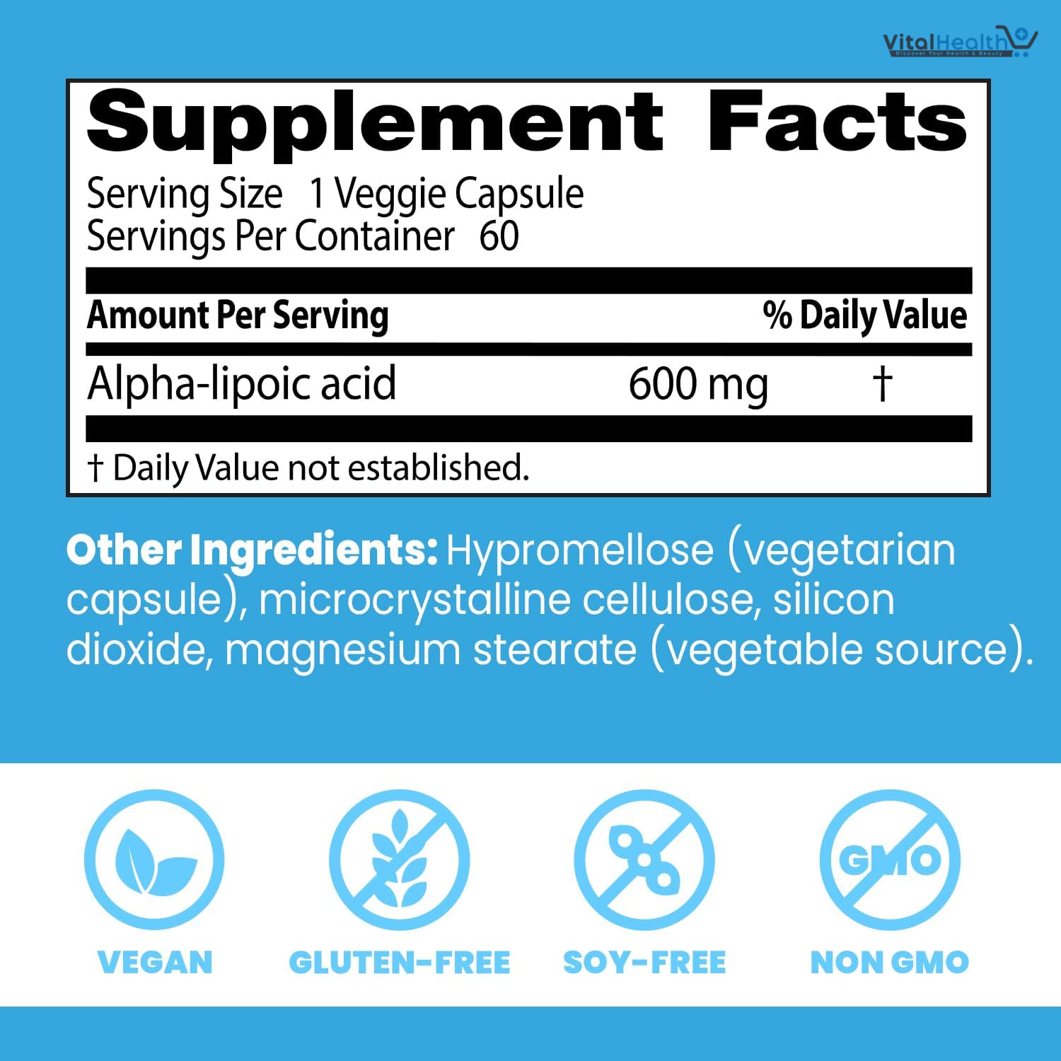 Alpha Lipoic Acid 600 mg, Modified cellulose (vegetarian capsule), microcrystalline cellulose, magnesium silicate, silicon dioxide, magnesium stearate (vegetable source).