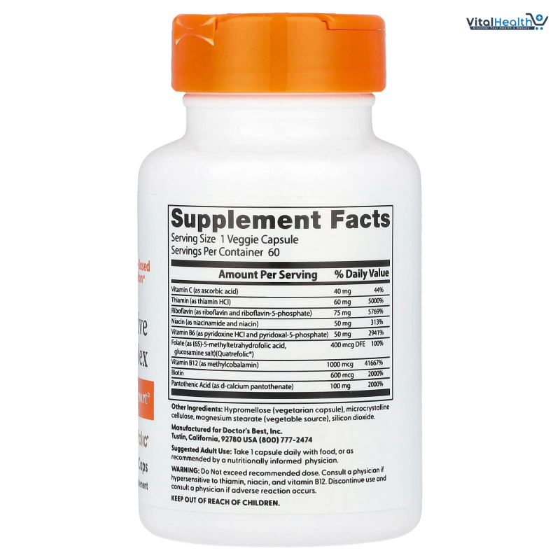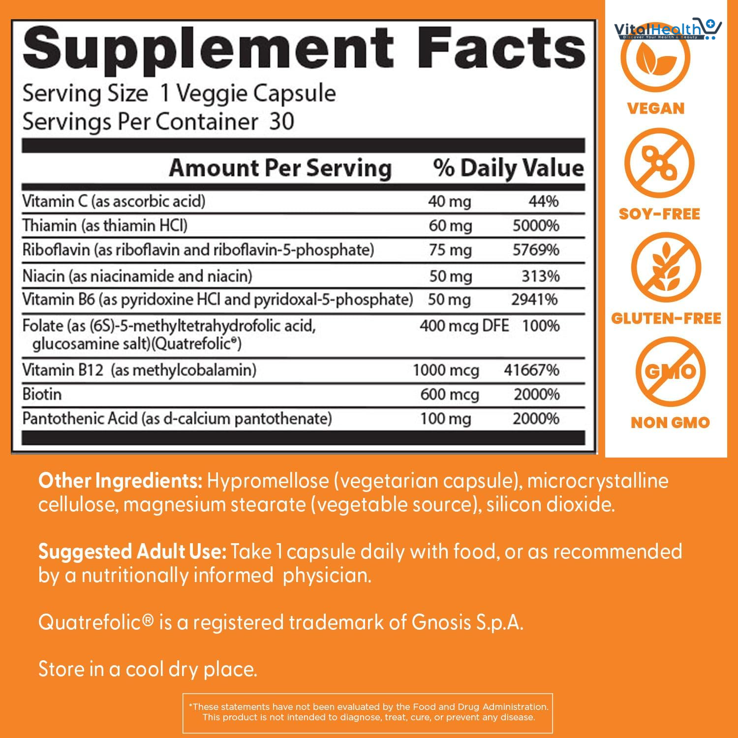 Vitamin C (as ascorbic acid) 40mg, Vitamin B1 (Thiamin, as hydrochloride) 60mg, Vitamin B2 (as riboflavin and riboflavin-5-Phosphate) 75mg, Vitamin B3 (as niacin and niacinamide) 50mg, Vitamin B6 (as pyridoxine hydrochloride and pyridoxal-5-phosphate) 50mg, Folate (6S)-5-methyltetrahydrofolate (MTHF) 400 mcg (as (6S)-5-methyltetrahydrofolic acid, glucosamine salt from Quatrefolic), Vitamin B12 (as methylcobalamin) 1000mcg, Biotin 600mcg, Pantothenic acid (as calcium pantothenate) 100 mg, Modified cellulose (vegetarian capsule), microcrystalline cellulose, ascorbyl palmitate, silicon dioxide.
