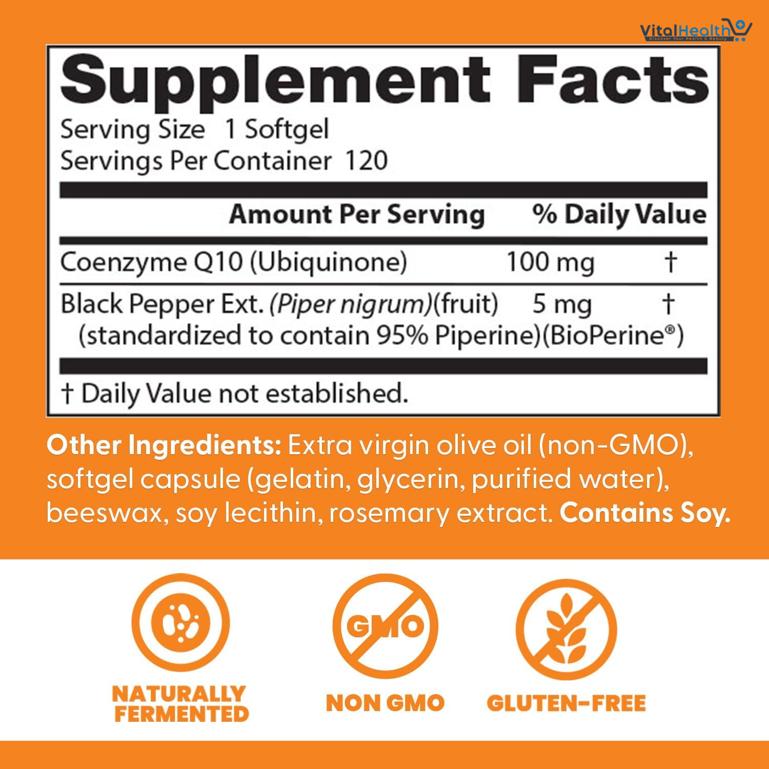 Coenzyme Q10 100 mg, Black pepper ext. (fruit)(BioPerine) 5 mg; Extra virgin olive oil (non-GMO), beeswax, soy lecithin, rosemary extract, softgel capsule (gelatin, glycerin, purified water)
