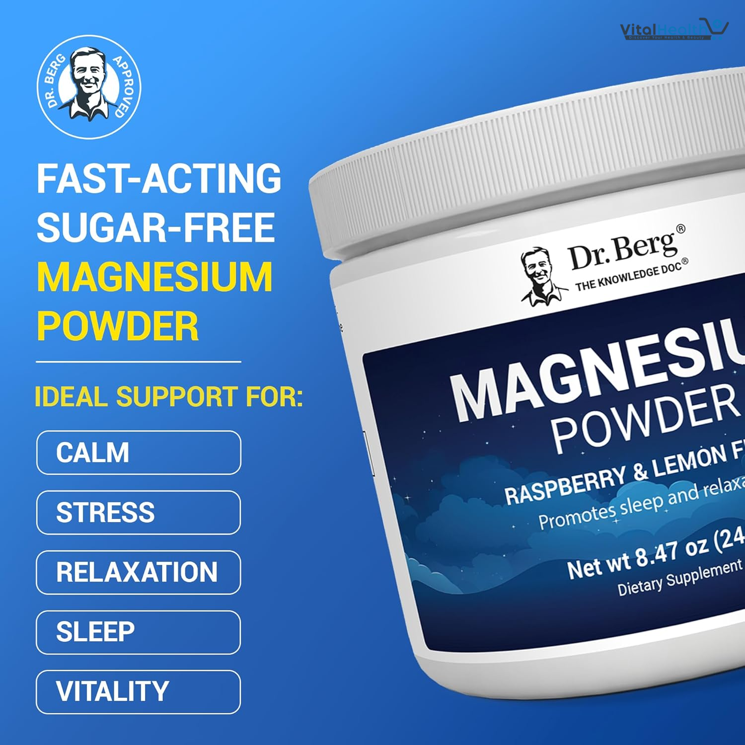 Magnesium Powder contains premium magnesium glycinate, a more easily absorbed form of magnesium. It has vitamin D, vitamin B6, and zinc to improve absorption and effectiveness.effectiveness. Dr. Berg Magnesium Powder is a fast-acting formula that delivers a daily dose of magnesium, promoting relaxation, deep sleep, balanced moods, nerve function, and strong bone health. It also boosts vitality, providing a comprehensive solution for those seeking to support recovery and overall well-being.
