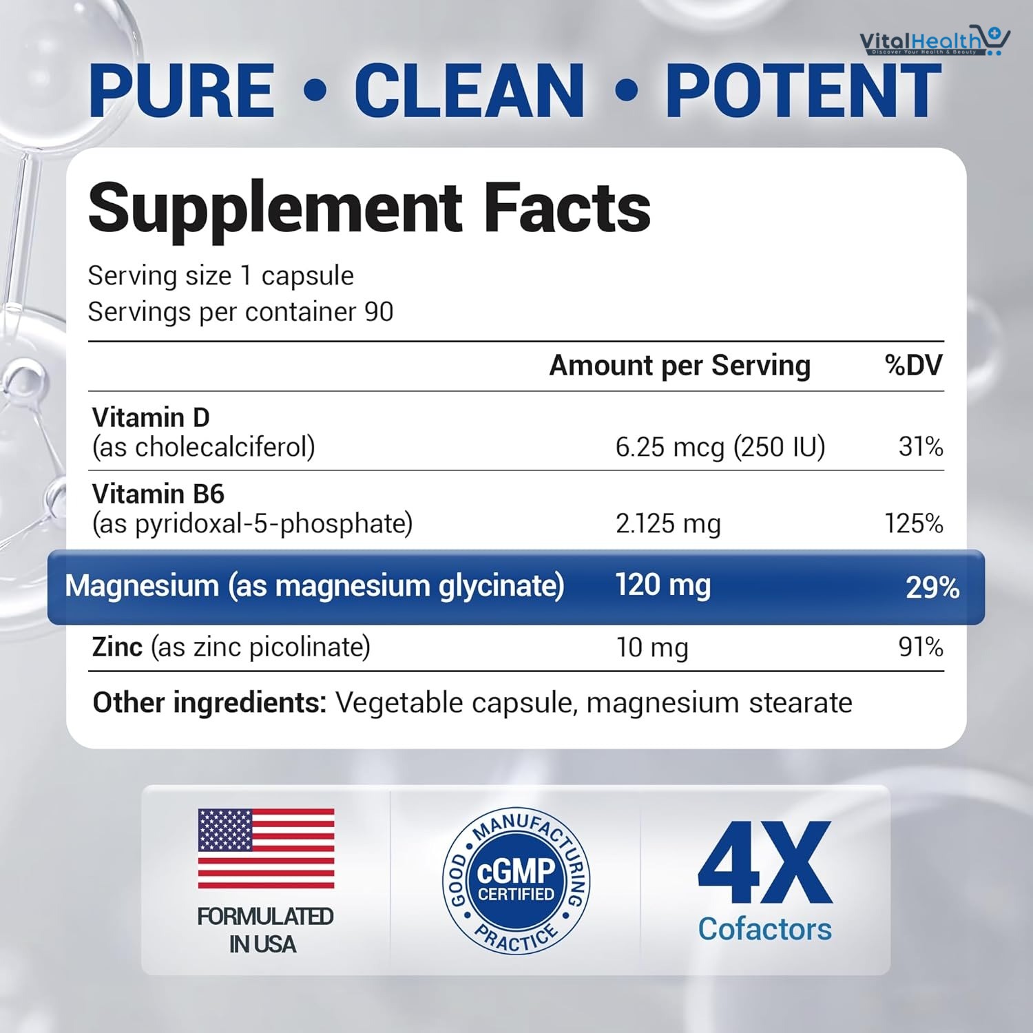 Extensively researched formula: Features four powerful key ingredients: magnesium, vitamin B6, vitamin D3 and zinc with 120 mg of magnesium glycinate, 6.5 mg of vitamin B6, 100 IU of vitamin D3, and 10 mg of zinc per magnesium glycinate capsule.