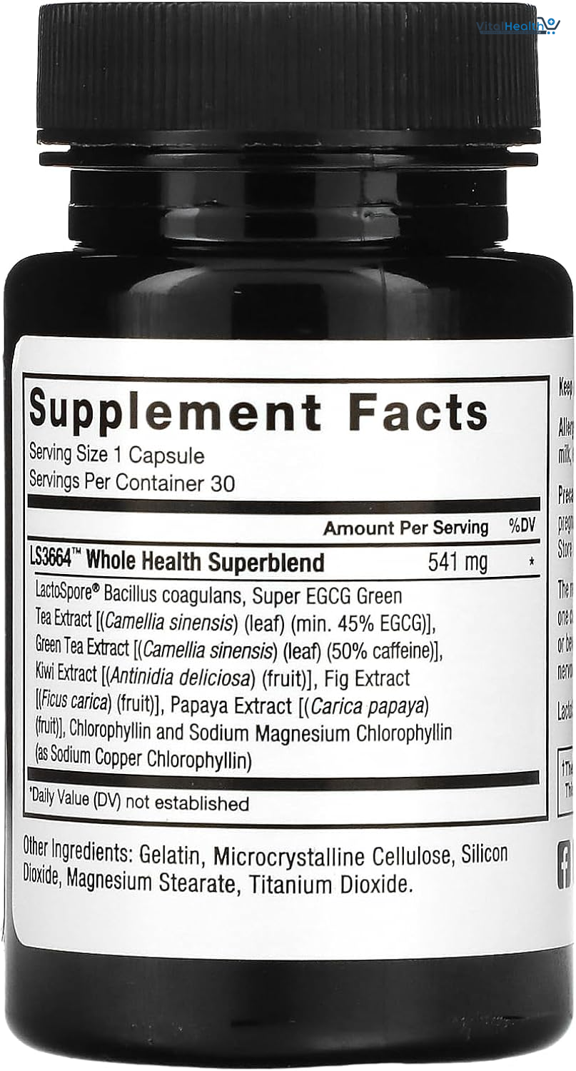 LS3664TM Whole Health Superblend LactoSpore® Bacillus coagulans, Super EGCG Green Tea (Camellia sinensis) Extract (leaf) (min. 45% EGCG), Green Tea (Camellia sinensis) Extract (leaf) (50% caffeine), Kiwi (Actinidia chinensis) Extract (fruit), Fig (Ficus carica) Extract (fruit), Papaya (Carica papaya) Extract (fruit), Chlorophyllin (as Sodium Magnesium Chlorophyllin and Sodium Copper Chlorophyllin), Gelatin, Magnesium Stearate, Microcrystalline Cellulose, Titanium Dioxide, Silicon Dioxide.