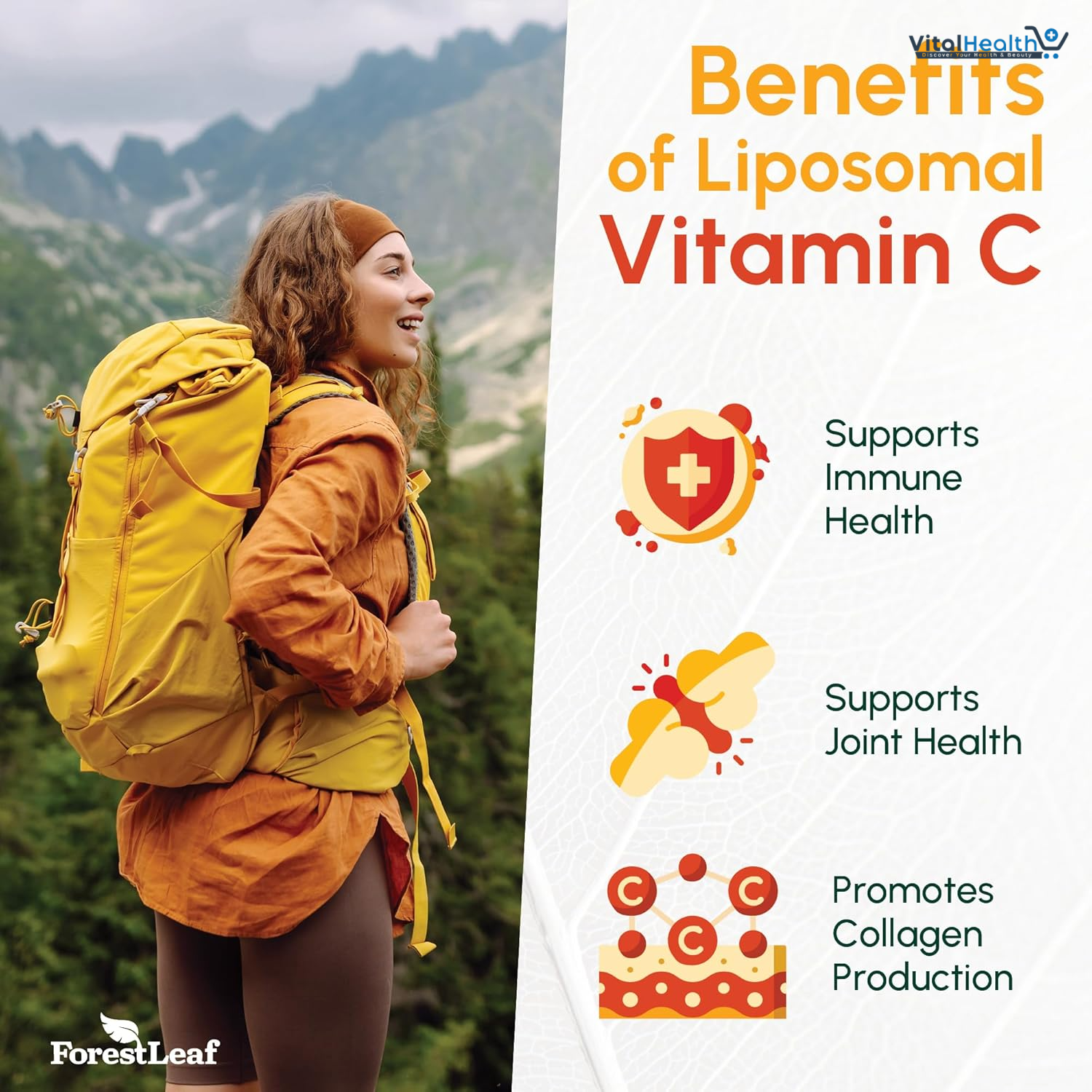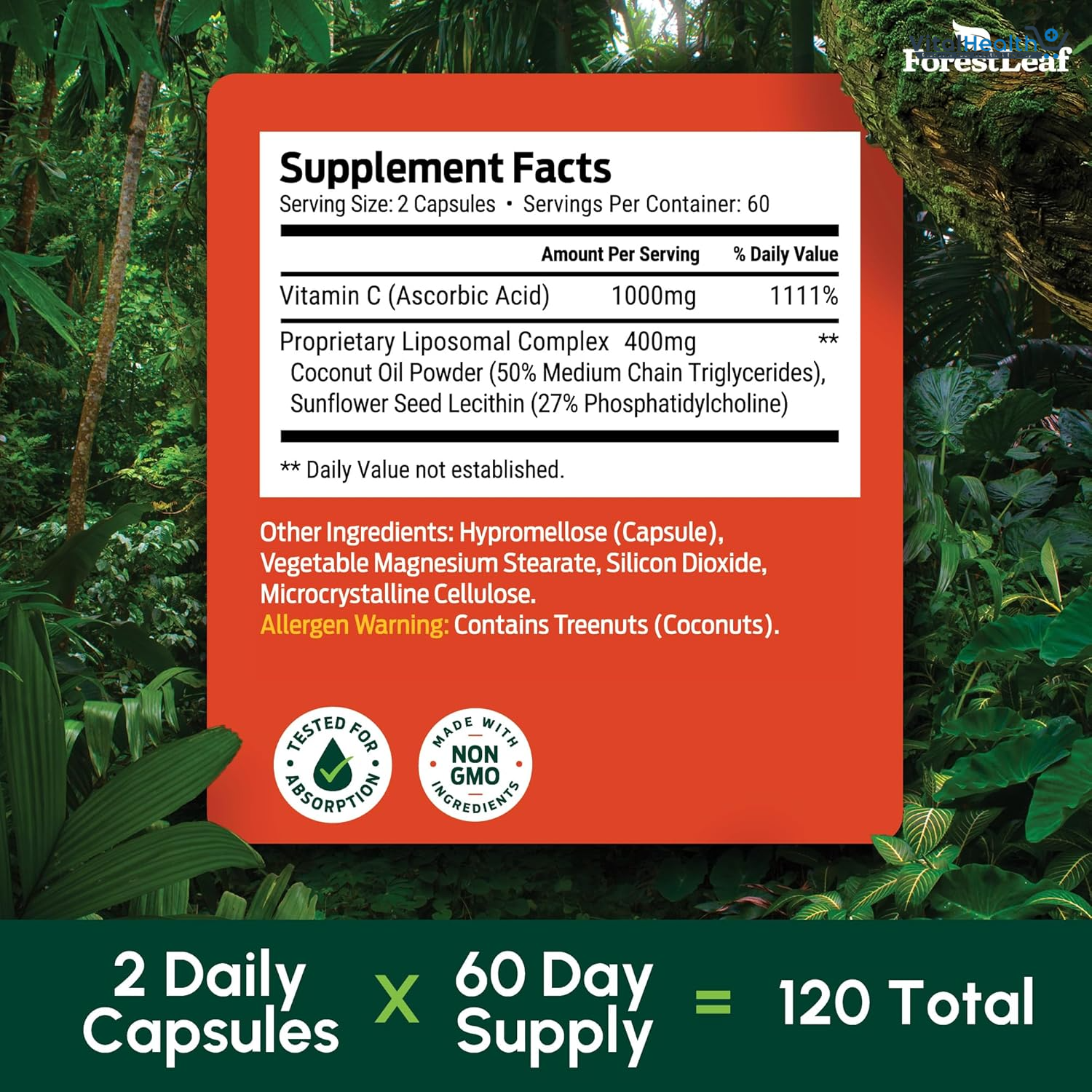 It boost your immunity with ForestLeaf liposomal Vitamin C capsules. Forestleaf vitamin c capsules blend the powerful benefits of MCT oil and sunflower lecithin with dry vitamin c liposomal technology for maximum absorption. Loaded with Vitamin C Support your body year-round with our maximum potency liposomal vitamin c 1000mg. Just two capsules of Forestleaf liposomal vitamin c 1000mg a day help protect your body against harmful symptomatic and asymptomatic illness. ForestLeaf liposomal vitamin c is non-GMO, free of sugar, gluten, dairy and soy, and preservative free. 120 vegan capsules (Allergen Warning: Contains Treenuts, Coconuts).