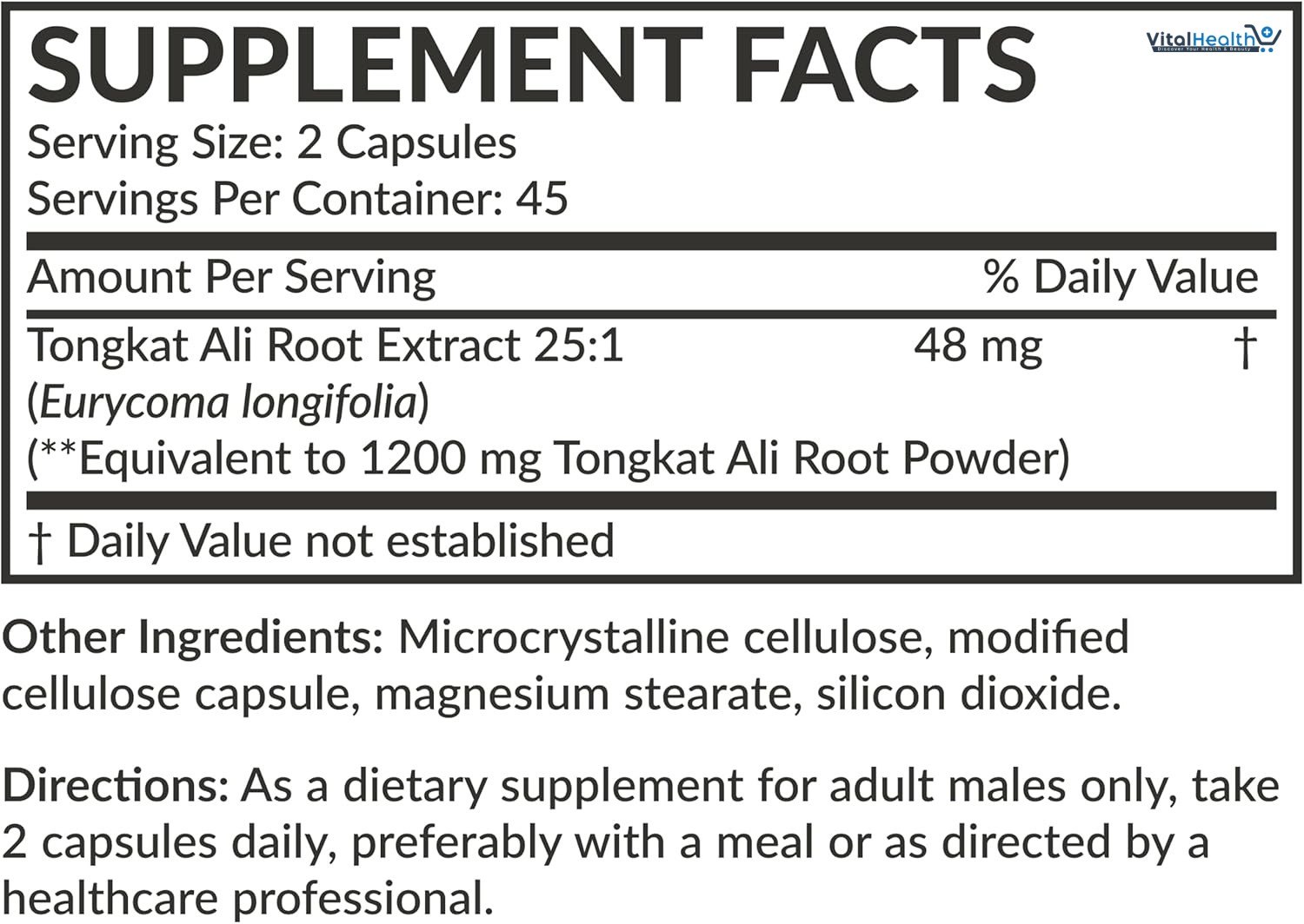 Ingredients: Tongkat Ali Root Extract (Eurycoma longifolia) (From 100:1 extractmeyenii) (From 1000 mg of 4:1 extract)