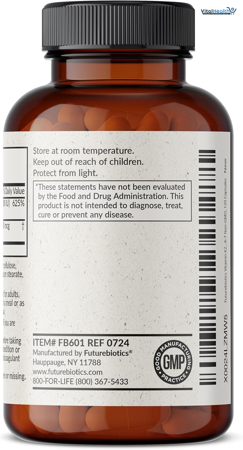 Futurebiotics Vitamins K2+D3 supplies the perfect match. While the benefits of Vitamin D are well known, many don't realize that Vitamin D needs Vitamin K2 to maximize its benefits. This formula helps the proper absorption of calcium with D3, while providing the correct distribution to your bones where you need it most. We only use superior sourced vitamins that are tested and verified for potency, purity and quality. Through our state-of-the-art cGMP Facility, Futurebiotics ensures confidence in the high standards of our products by identifying the quality of every batch provided.
