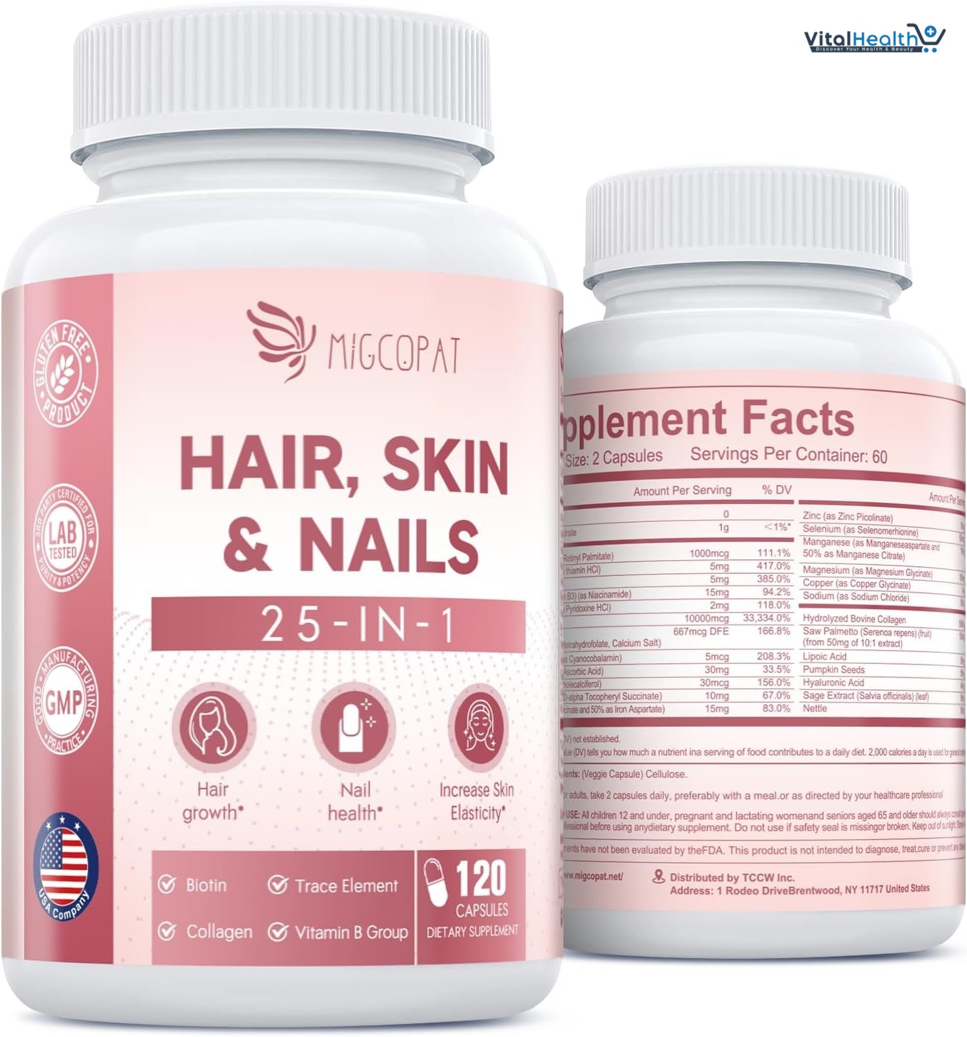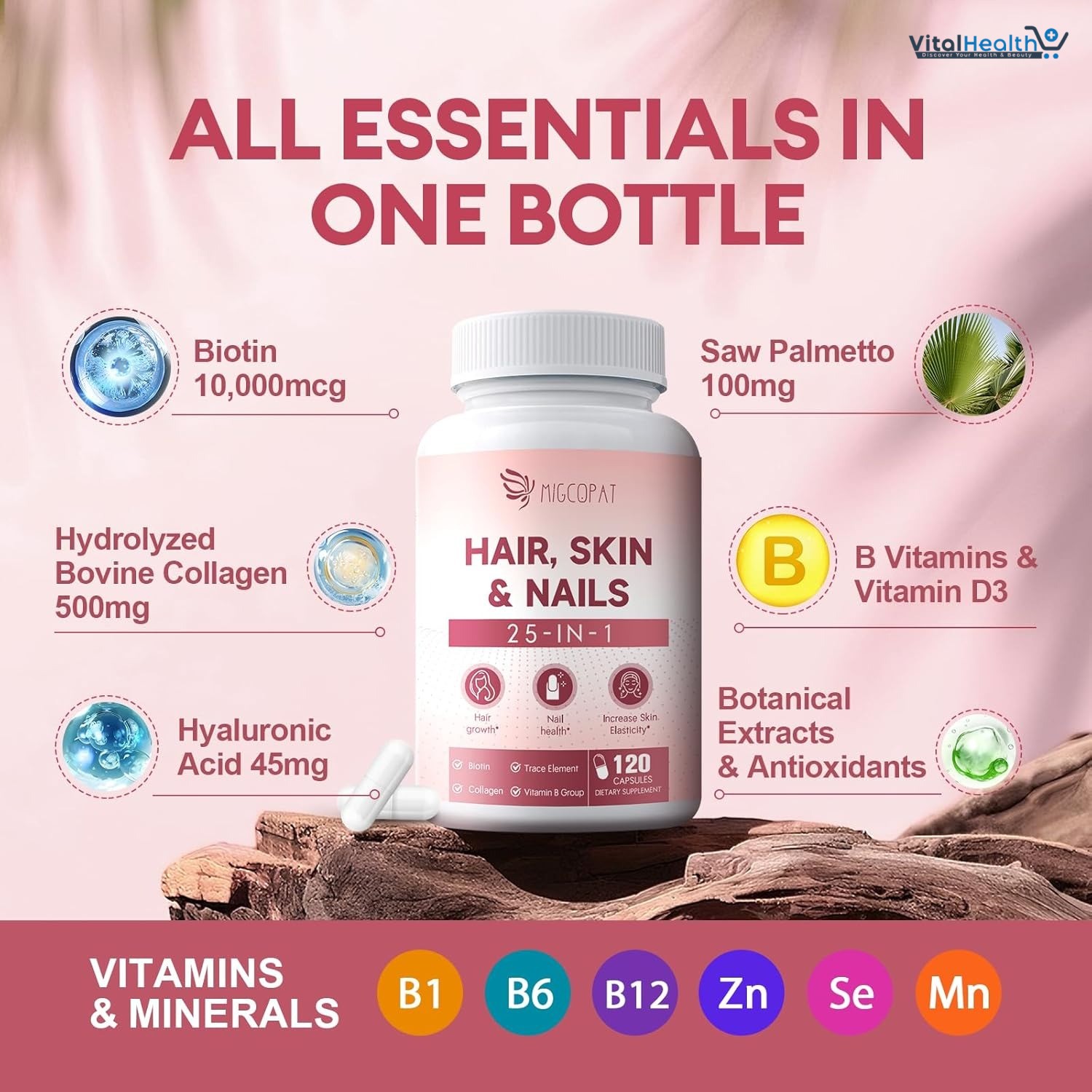 Boost your natural beauty with our advanced 25-in-1 supplement formula. Each capsule contains 500mg Hydrolyzed Bovine Collagen, 100mg Saw Palmetto, 50mg Hyaluronic Acid, and key nutrients to support healthy hair, skin, and nails. This blend of vitamins, minerals, and plant-based botanicals helps fill dietary gaps and promotes overall wellness.