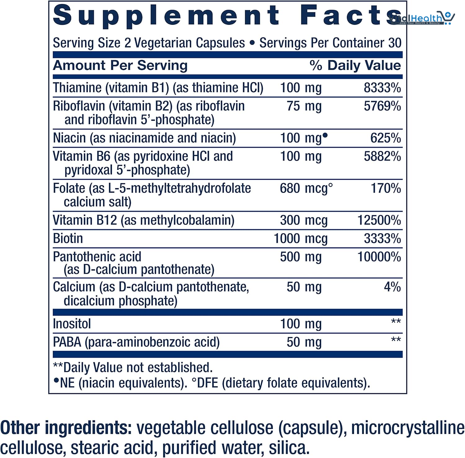 Thiamine (vitamin B1) (as thiamine HCl) 100 mg, Riboflavin (vitamin B2) (as riboflavin and riboflavin 5'-phosphate) 75mg, Niacin (as niacinamide and niacin) 100 mg. Vitamin B6 (as pyridoxine HCl and pyridoxal 5'-phosphate) 100 mg, Folate (as L-5-methyltetrahydrofolate calcium salt) 680 mcg, Vitamin B12 (as methylcobalamin) 300 mcg, Biotin 1000 mcg, Pantothenic acid (as D-calcium pantothenate) 500mg, Calcium (as D-calcium pantothenate, dicalcium phosphate) 50 mg, Inositol 100 mg, PABA (para-aminobenzoic acid) 50 mg