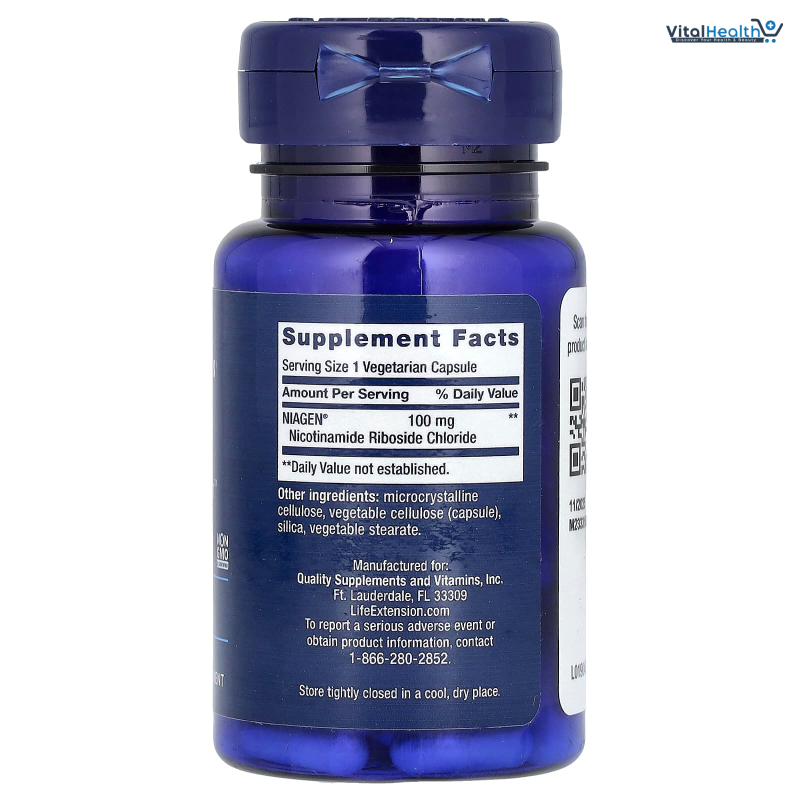 NIAGEN® Nicotinamide Riboside Chloride 100 mg, microcrystalline cellulose, vegetable cellulose (capsule), silica, vegetable stearate.