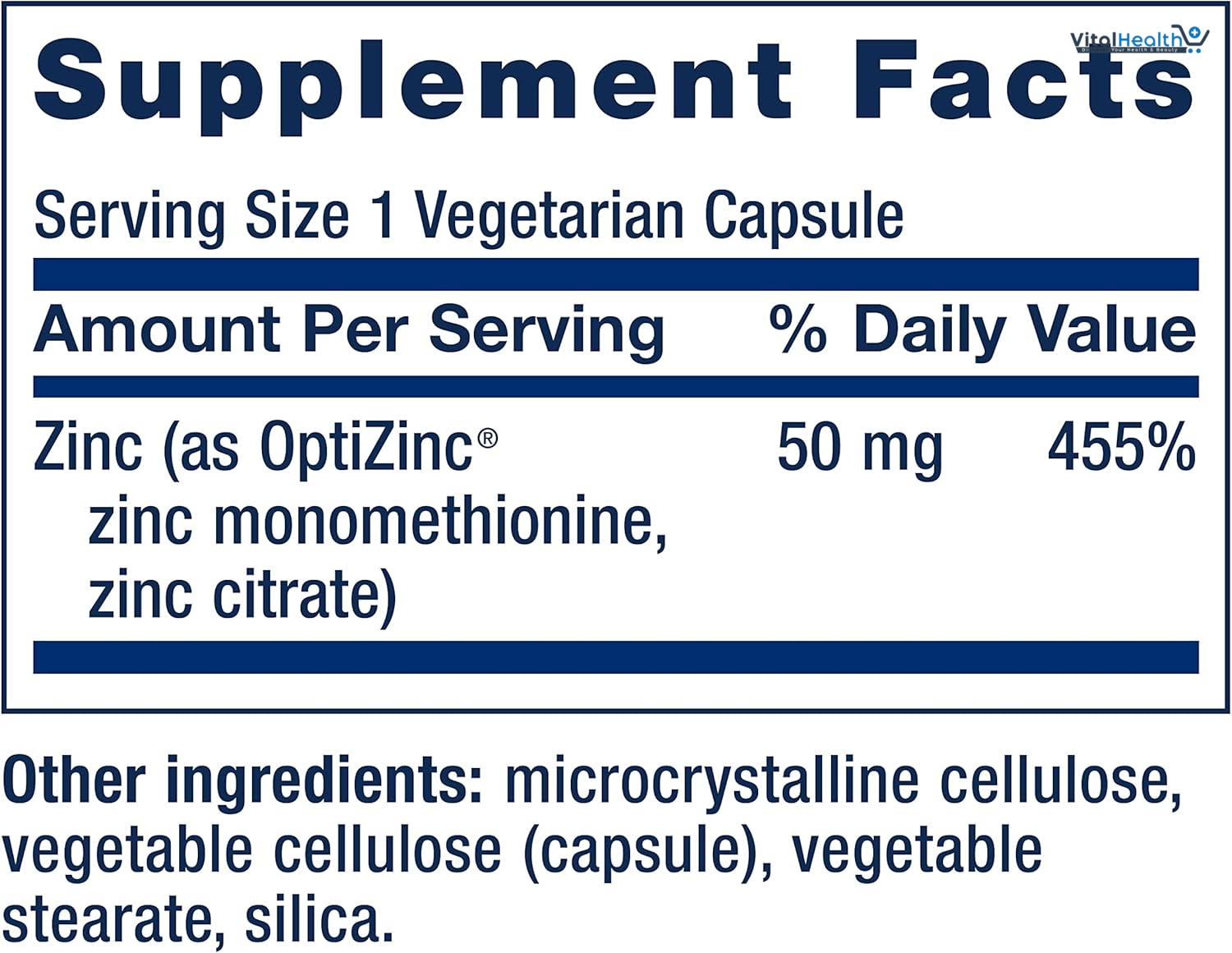 Zinc (as OptiZinc zinc monomethionine, zinc citrate), microcrystalline cellulose, vegetable cellulose (capsule), vegetable stearate, silica
