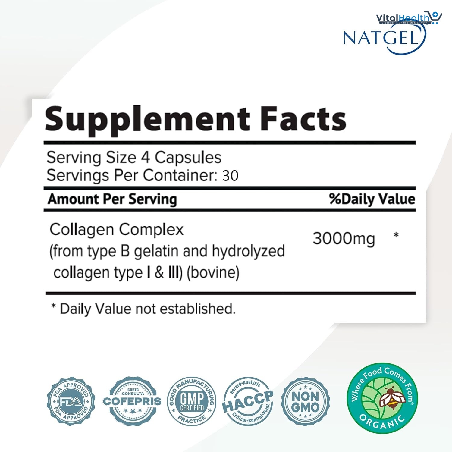 NATGEL Collagen peptides 3000mg supports healthy glowing skin, helps maintain strong hair and nails, improves skin elasticity and smoothness. It provides advanced collagen support. Each serving delivers 3000mg of hydrolyzed collagen peptides (Type I & III) to promote youthful skin, stronger hair, and healthy joints.