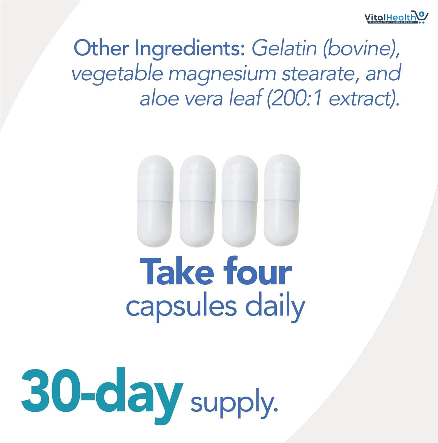 Other Ingredients: Gelatin (Bovine), Vegetable Magnesium Stearate and aloe vera leaf.