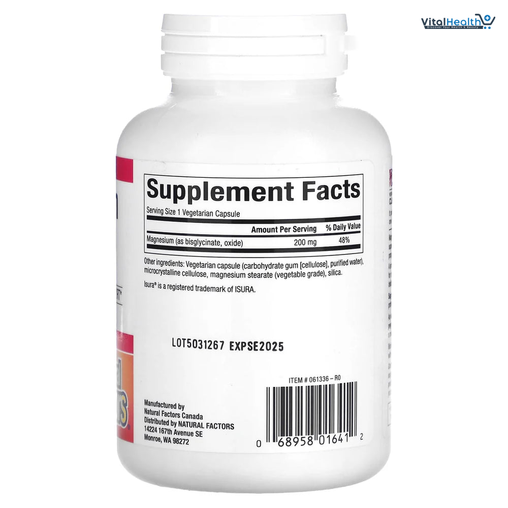 Natural Factors Magnesium Bisglycinate Pure provides 200 mg of this essential mineral to help support muscle function, including the heart muscle. This one-per-day, non-GMO magnesium is suitable for vegetarians and vegans, and is provided in a form that is easy on the stomach. Magnesium is an essential nutrient needed as an enzyme cofactor in more than 300 metabolic reactions to help support healthy bones, teeth, muscles, and nerves. We also need magnesium to metabolize nutrients and to produce the body's main form of energy, adenosine triphosphate (ATP).