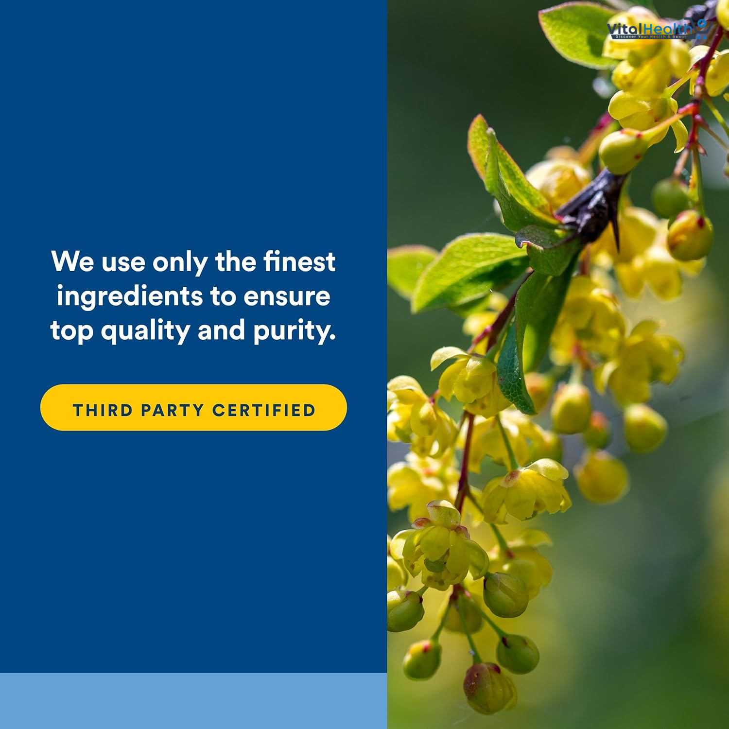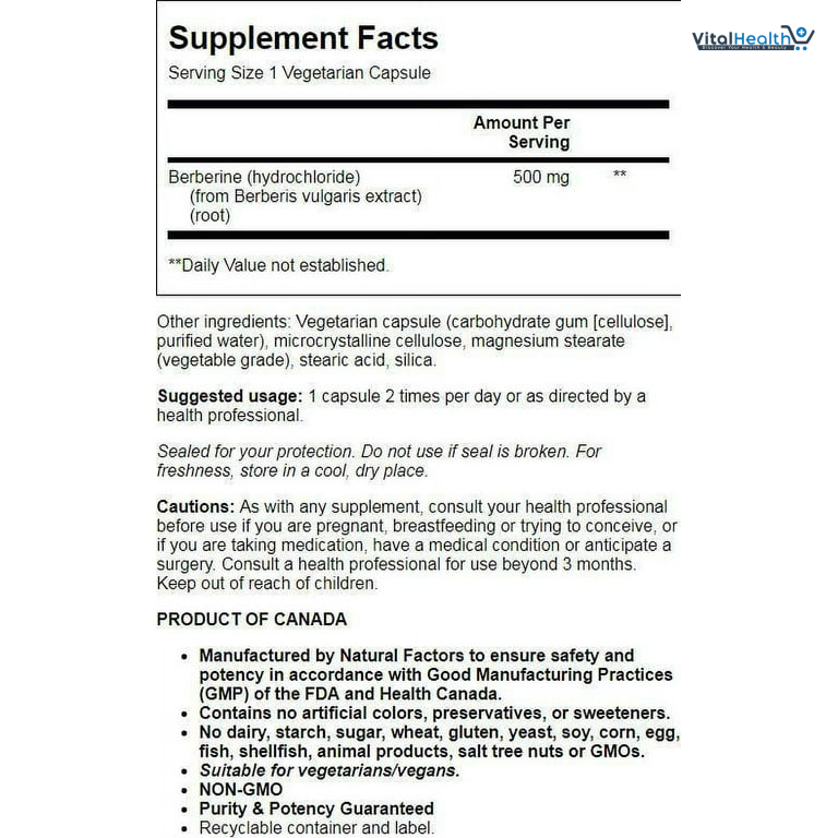 Berberine HCl 1000 mg, Vegetarian Capsule Hypromellose, Purified Water, Rice Flour, Magnesium Stearate, Silica, Stearic Acid