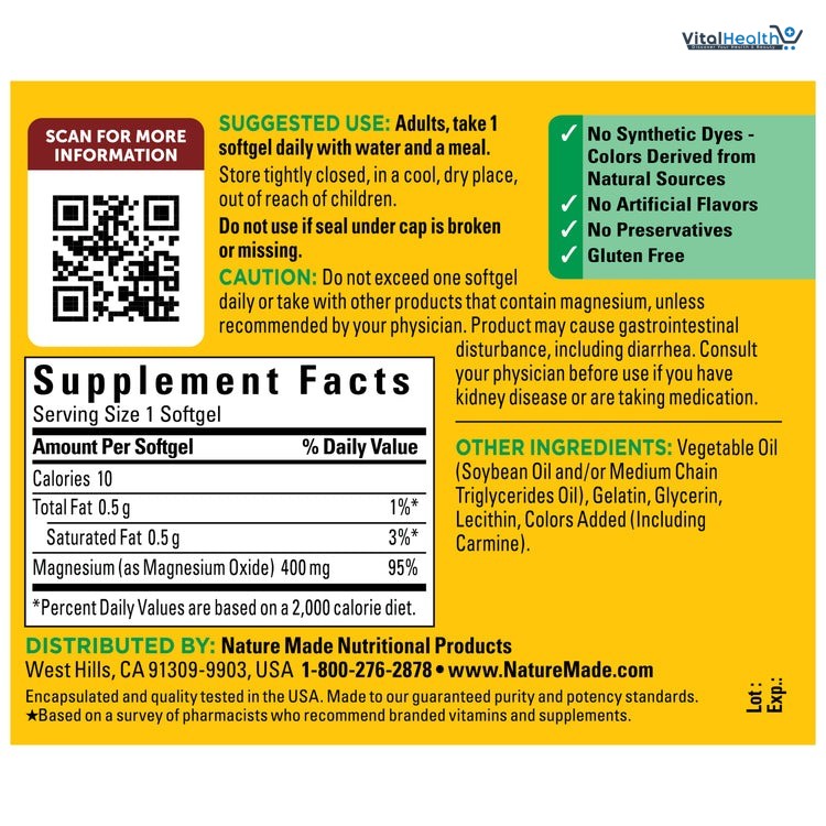Magnesium is a multifaceted mineral with many roles in the body. It supports essential nerve, muscle and heart function, helps convert food into cellular energy, and helps relax the body. Nature Made® High Absorption Magnesium Glycinate, 400 mg Extra Strength per serving, is chelated and has better absorption and GI tolerance than other Magnesium supplement forms such as Magnesium Oxide.