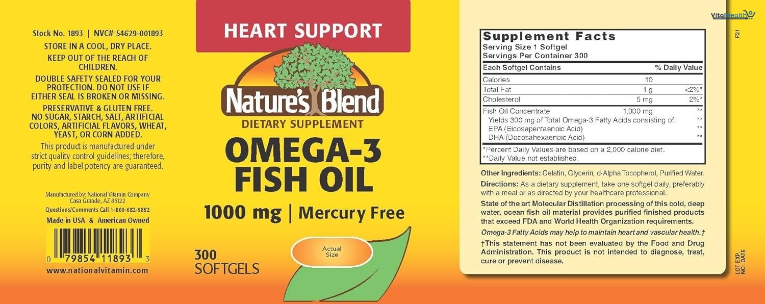 Omega-3 Fish Oil is a source of Omega-3 fatty acids EPA (Eicosapentaenoic Acid) and DHA (Docosahexaenoic Acid) that may support heart and vascular health.