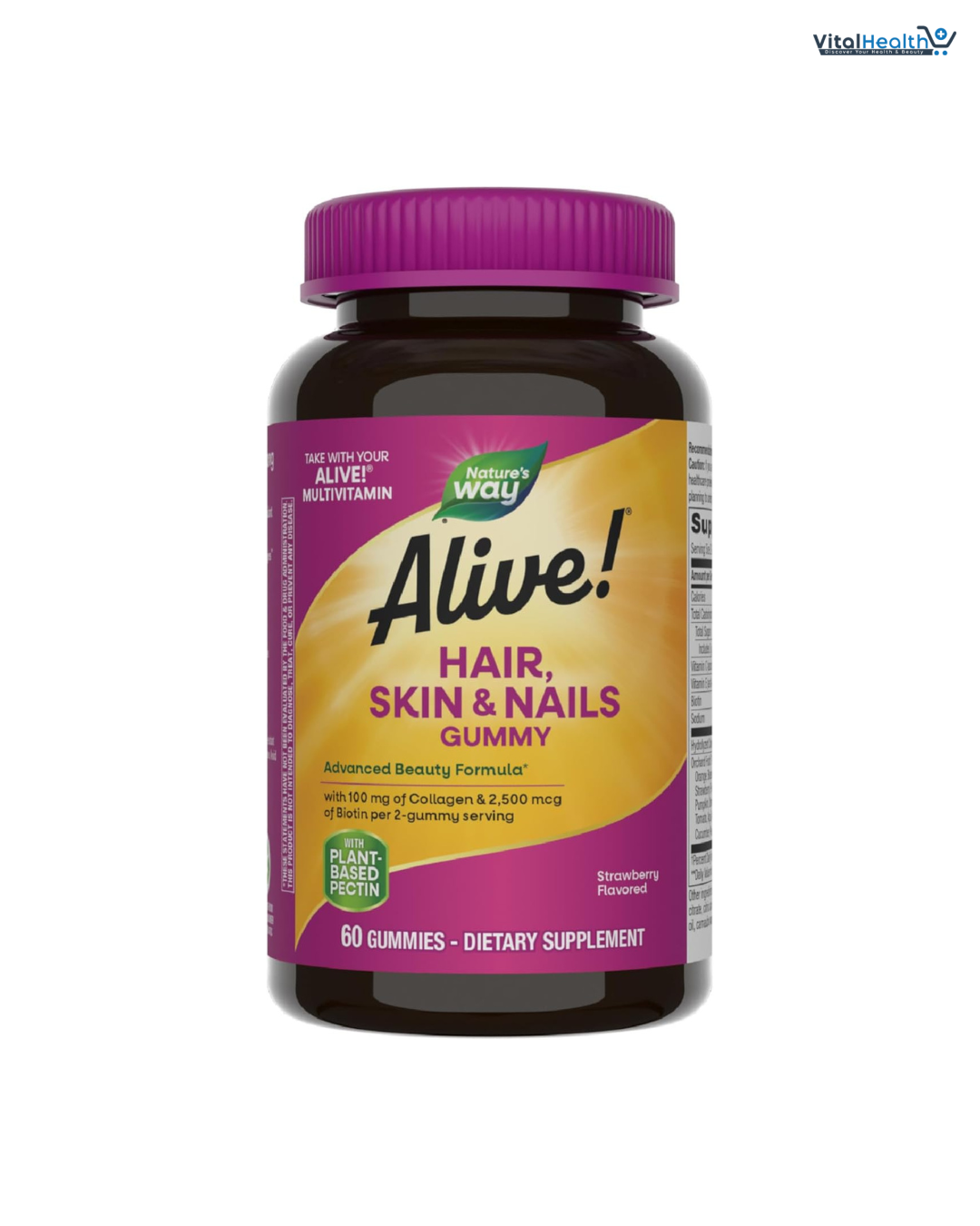 Nature's Way Alive! Hair, Skin & Nails Gummies are an advanced beauty formula to support lustrous hair, healthy skin, and strong nails. With collagen and biotin; take alongside your Alive! multivitamin.