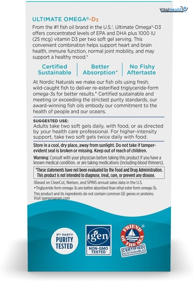 - Nordic Naturals Ultimate Omega-D3 features high concentration omega-3 fish oil in soft gels; The added Vitamin D3 aids in calcium absorption & supports mood & immune system health