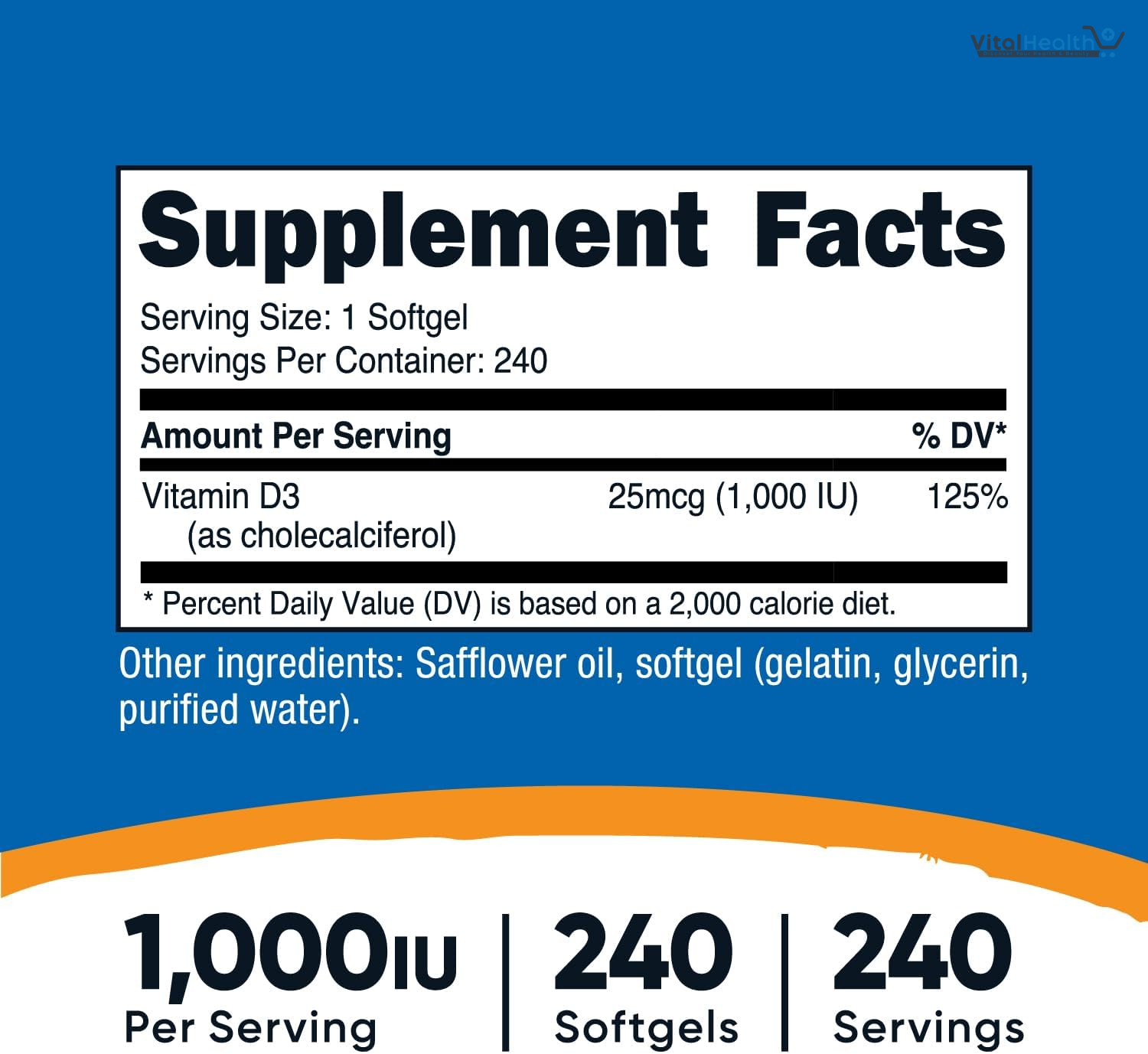 Includes 240 softgels per bottle, offering a long-lasting supply and exceptional value for money, ensuring consistent Vitamin D3 intake for overall wellness. Ideal for individuals needing to increase vitamin D levels due to deficiencies caused by limited sunlight exposure. It is beneficial for those seeking to strengthen bones and prevent osteoporosis through adequate vitamin D intake. It is helpful for users wanting to enhance immune function, especially during cold and flu seasons.