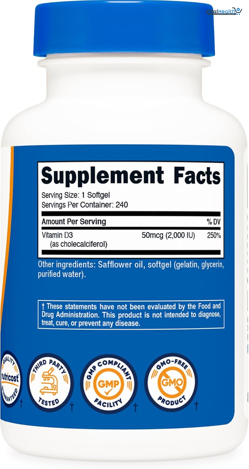 Includes 240 softgels per bottle, offering a long-lasting supply and exceptional value for money, ensuring consistent Vitamin D3 intake for overall wellness. Ideal for individuals needing to increase vitamin D levels due to deficiencies caused by limited sunlight exposure. It is beneficial for those seeking to strengthen bones and prevent osteoporosis through adequate vitamin D intake. It is helpful for users wanting to enhance immune function, especially during cold and flu seasons.