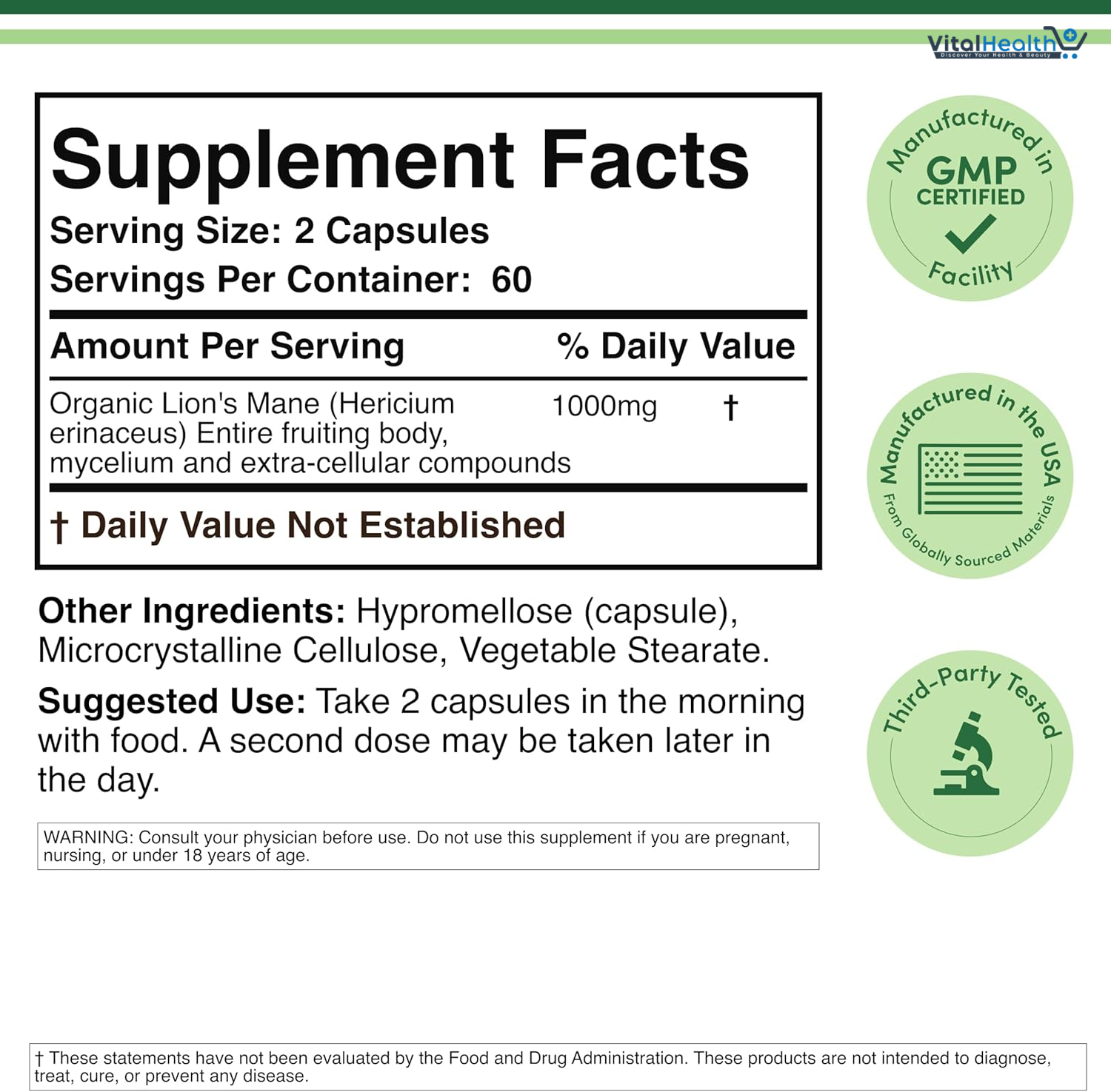 Lion’s Mane 1,000mg, Other Ingredients: Hypromellose (capsule), rice flour