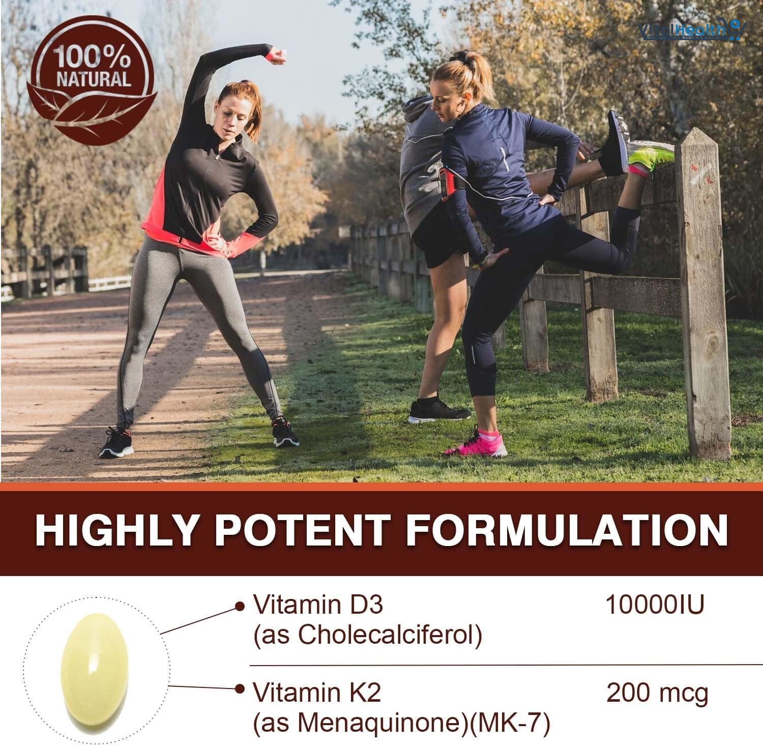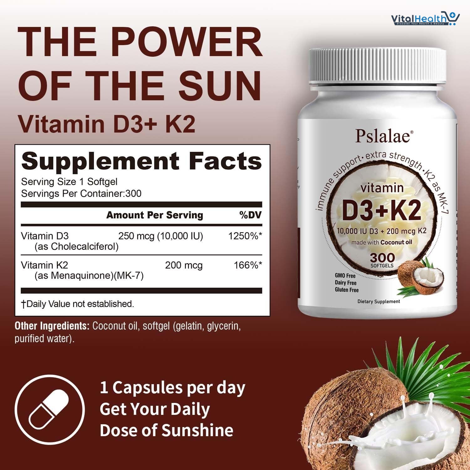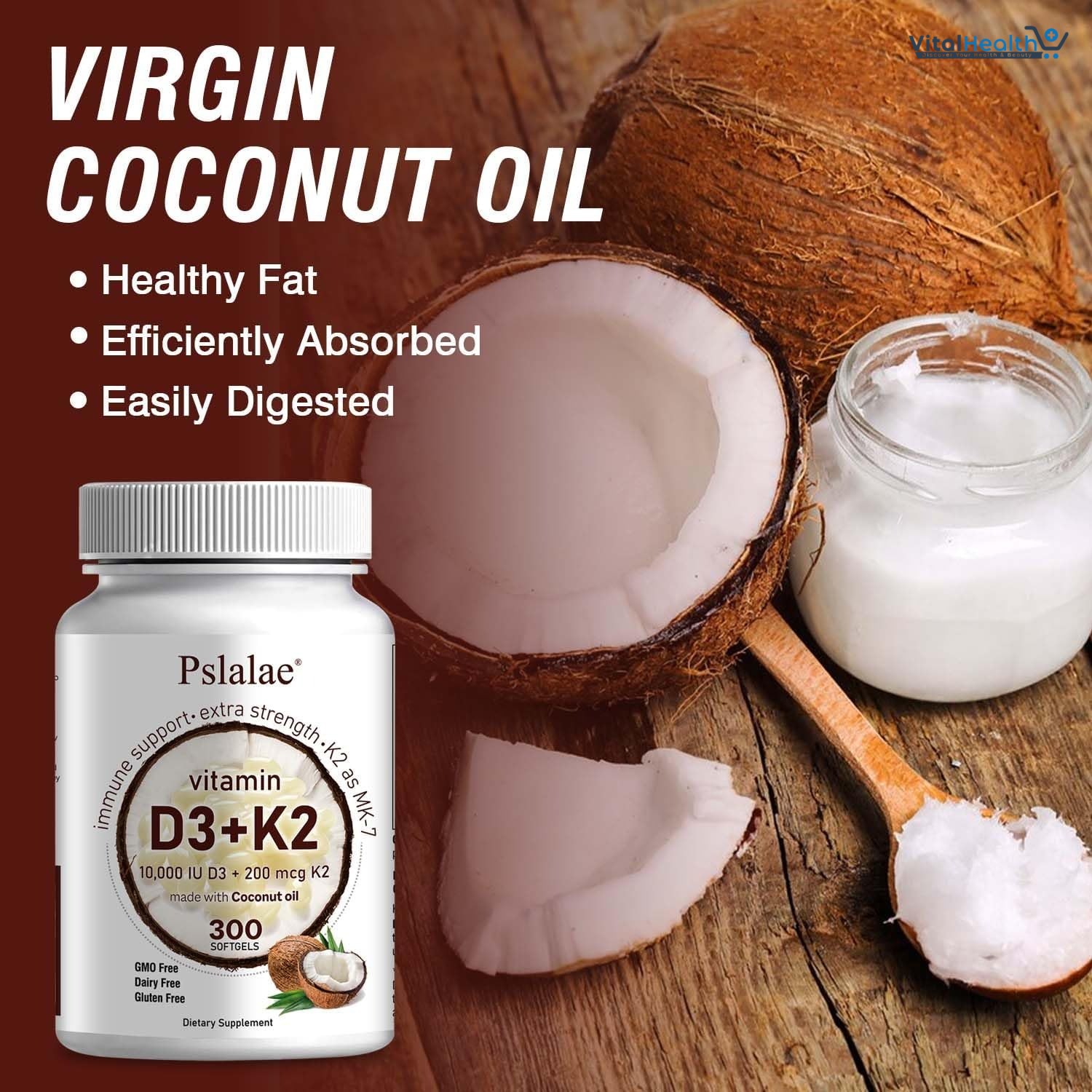 Pslalae Vitamin D3 K2 softgels are a powerful 2-in-1 supplement designed to support your bones, heart, and immune system. With 10000 IU of Vitamin D3 and 200 mcg of Vitamin K2 (MK-7), this formula ensures maximum calcium absorption—delivered in coconut oil for enhanced bioavailability.