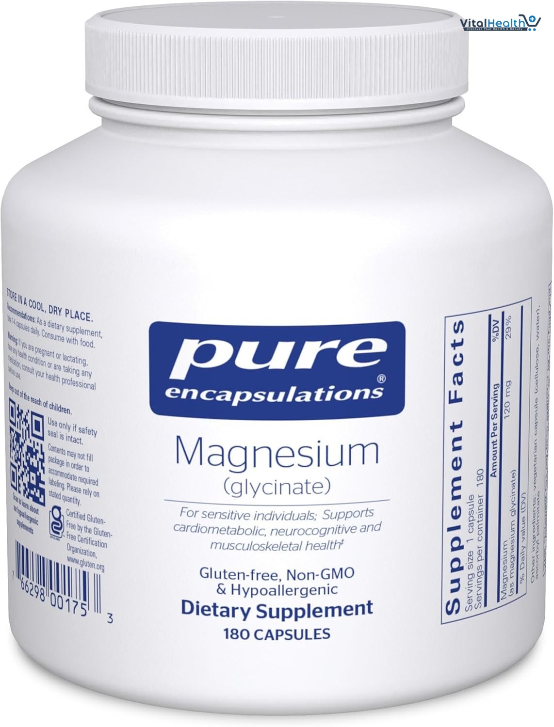 Pure Encapsulations Magnesium (Glycinate) is a high-quality, bioavailable supplement designed to support overall wellness. It promotes better sleep, stress relief, muscle relaxation, nerve health, and heart function. Now gaining popularity in Pakistan, this supplement is especially ideal for people struggling with anxiety, poor sleep, fatigue, or muscle cramps. It is free from allergens, GMOs, and artificial additives, making it a preferred choice for clean supplement users.