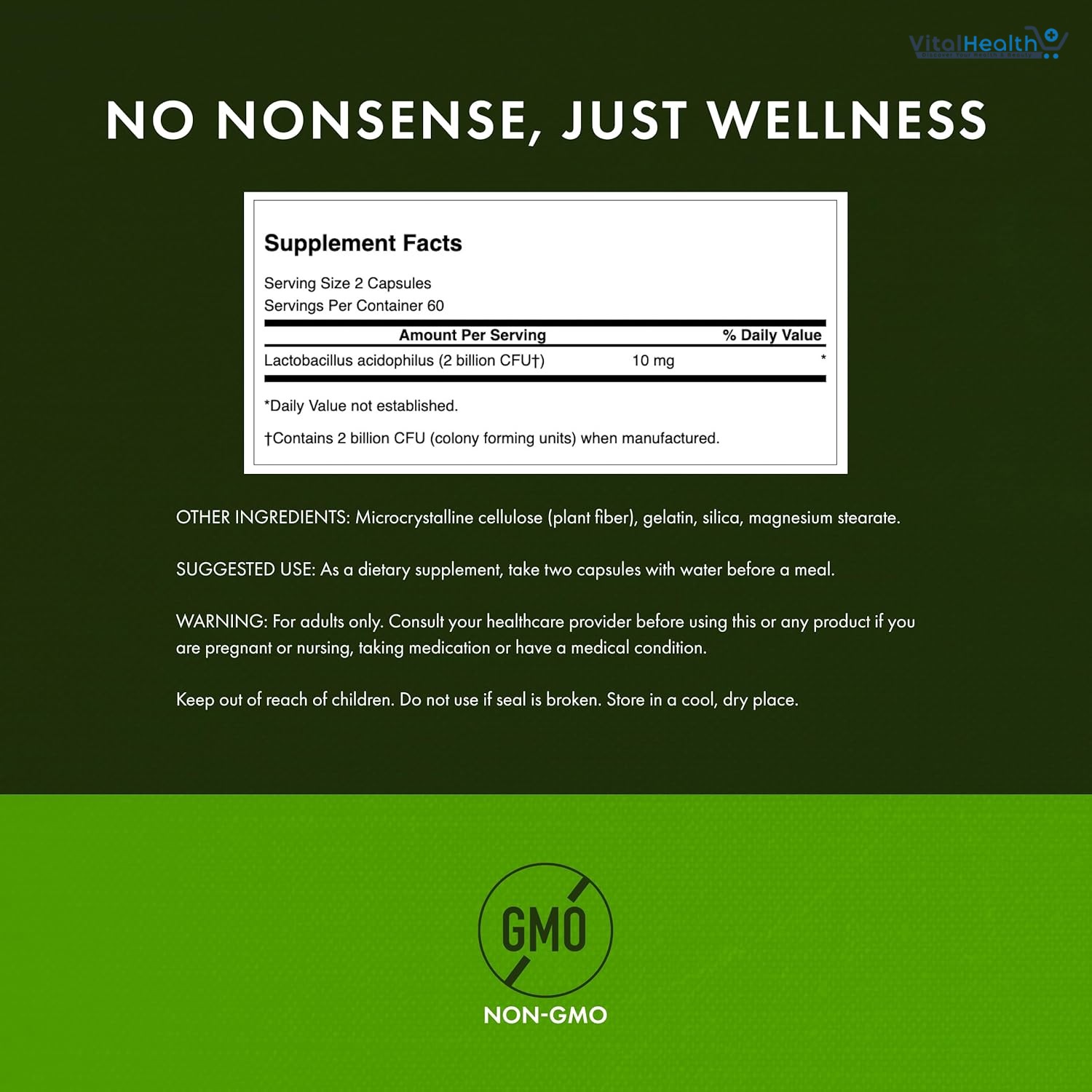Lactobacillus acidophilus 2 billion,Other Microcrystalline cellulose , gelatin, silica, magnesium stearate., take two capsules with water before a meal. For children, one capsule with water before a meal.,Lactobacillus acidophilus 2 billion,Other Microcrystalline cellulose , gelatin, silica, magnesium stearate.