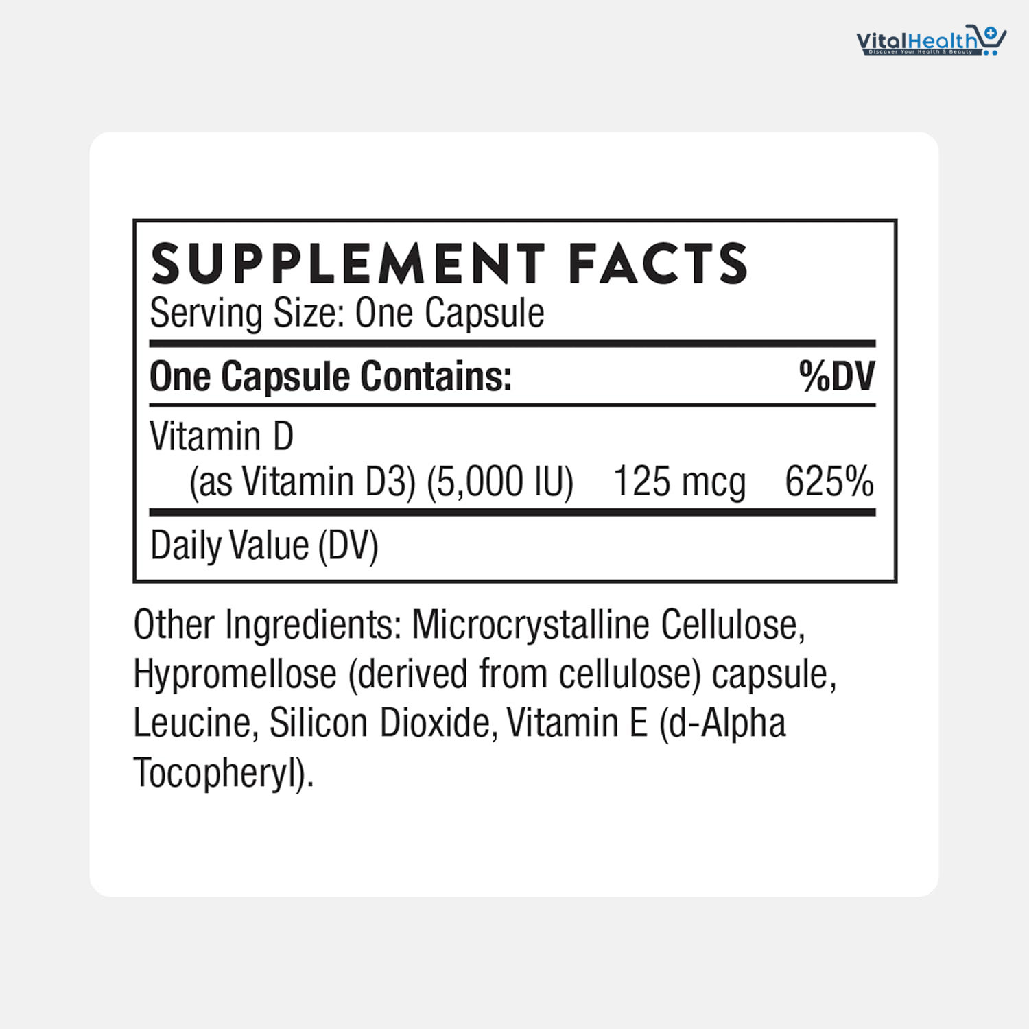 Vitamin D3 125mcg, Hypromellose (derived from cellulose) capsule, Leucine, Microcrystalline Cellulose, Silicon Dioxide, Vitamin E (d-Alpha-Tocopherol)