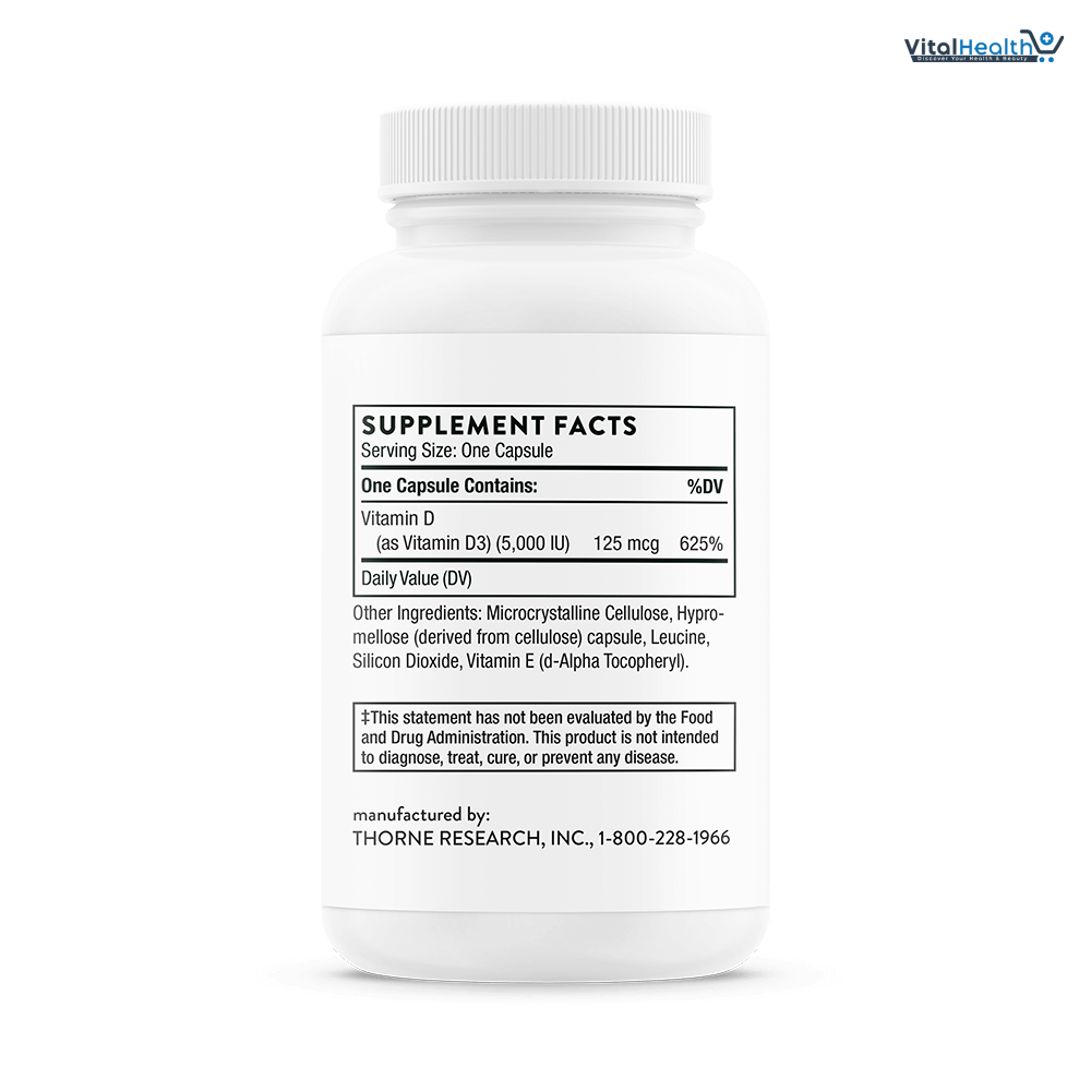 Thorne’s D-5,000 contains 5,000 IU of high-quality vitamin D3 and is NSF Certified for Sport®. Although it is well known that direct sunlight is a natural source of vitamin D, many individuals, especially the elderly, don’t get enough vitamin D from sunlight or from their diet. Be sure you get the vitamin D your body needs with Thorne’s easily absorbed Vitamin D-5,000. The optimal amount of vitamin D for an individual depends on many factors and varies from person to person. Therefore, the requirement for vitamin D supplementation should be individualized. Either of Thorne’s D-1,000 or D-5,000 can be an ideal way to maintain an optimal level of vitamin D in healthy individuals. Because athletes need to know their supplements are trustworthy and compliant, every batch of an NSF Certified for Sport® product is tested for compliance with label claims and to ensure the absence of nearly 300 substances banned by many major athletic organizations.