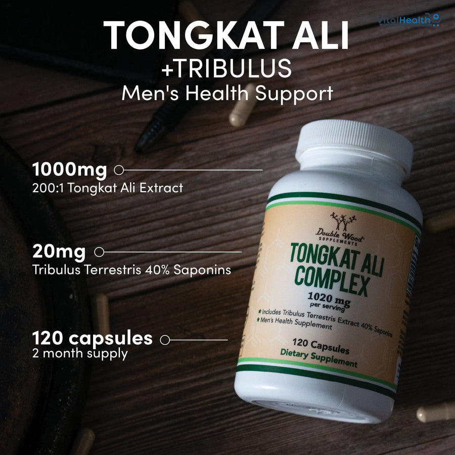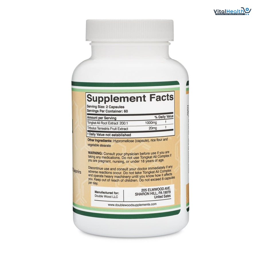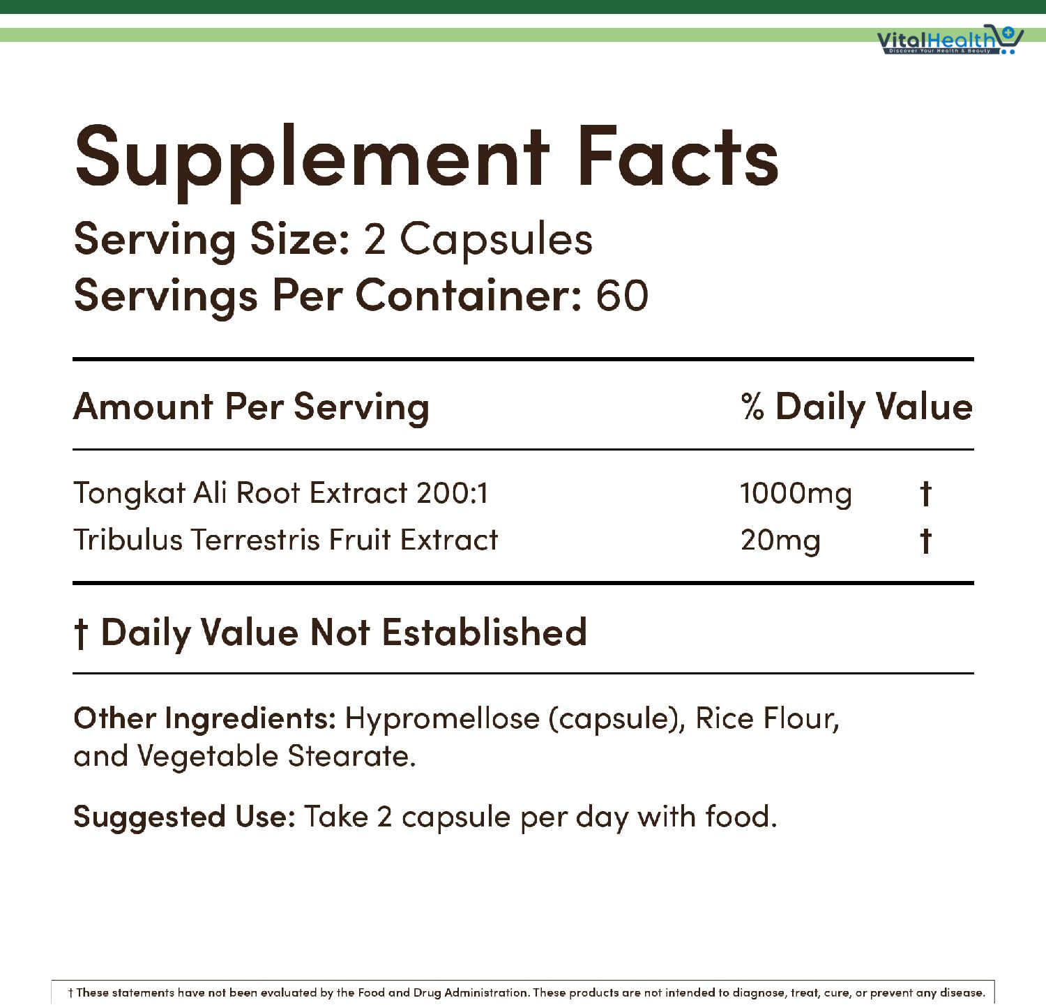 Eurycoma Longifolia Root Extract 200:1, Tribulus Terrestris 20mg, Other Ingredients: Veggie Capsule, Rice Flour.