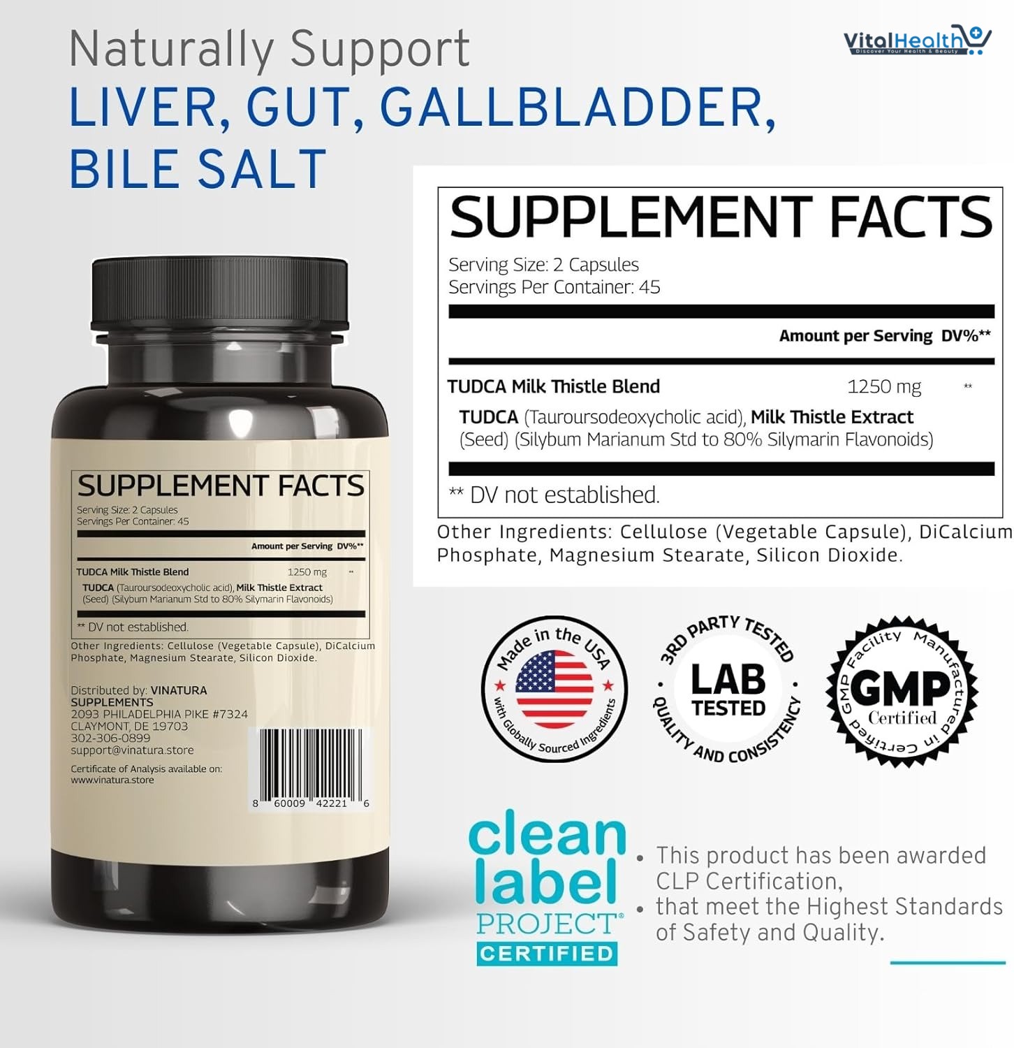 TUDCA with Milk Thistle Support your liver health in one powerful supplement. 90 capsules for 45 servings. Each serving contains 1250mg - the strongest liver supplement! Each serving contains TUDCA (or Tauroursodeoxycholic acid), a natural hydrophilic bile acid salt that helps to maintain hepatic and biliary health. This liver support supplement helps bile salts, gallbladder.