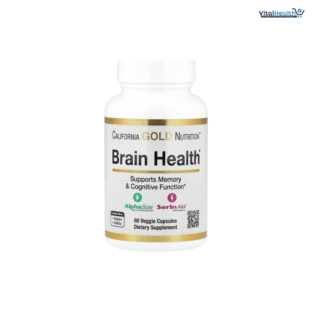 Premium Ingredients to Support Brain HealthOne of the prominent ingredients in this supplement is AlphaSize Alpha-Glyceryl Phosphoryl Choline. This substance is a bioavailable form of choline that increases the release of acetylcholine, a primary neurotransmitter involved in several cognitive functions, including learning, memory, concentration, recall, and focus. Our Brain Health supplement also includes SerinAid PhosphatidylSerine, a nutrient that can potentially provide numerous benefits. It helps proteins that manage membrane functions, assists the entry of nutrients into cells, and assists the exit of harmful, stress-related waste products out of cells. The support of these functions may help improve mental performance and mood, as well as reduce stress.California gold nutrition brain health contains alphasize alpha-glyceryl phosphoryl choline, serinaid phosphatidylserine, phosphorus, and calcium in veggie capsules. It is suitable for vegetarians and vegans and formulated without gluten or GMOs.