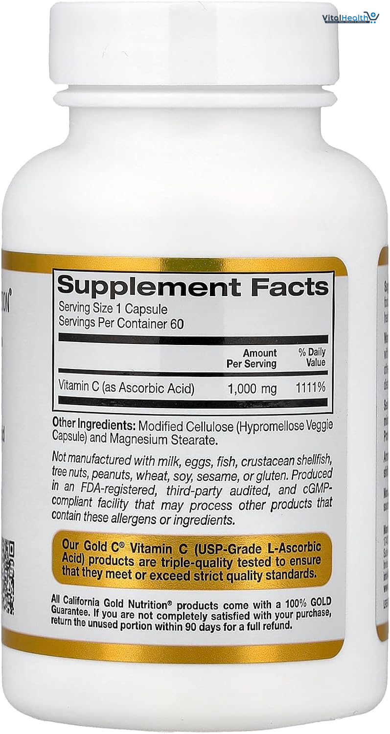 California Gold Nutrition Gold C,1000 mg Featuring USP Grade Vitamin C Suitable for Vegans & Vegetarians Formulated to Contain: No Gluten, No GMOs, No Soy Produced in a 3rd Party Audited cGMP Registered (Certified) Facility100% Gold Guarantee California Gold Nutrition Gold C Vitamin C is USP Grade L-Ascorbic Acid and is triple quality tested to ensure that it meets or exceeds strict quality standards.