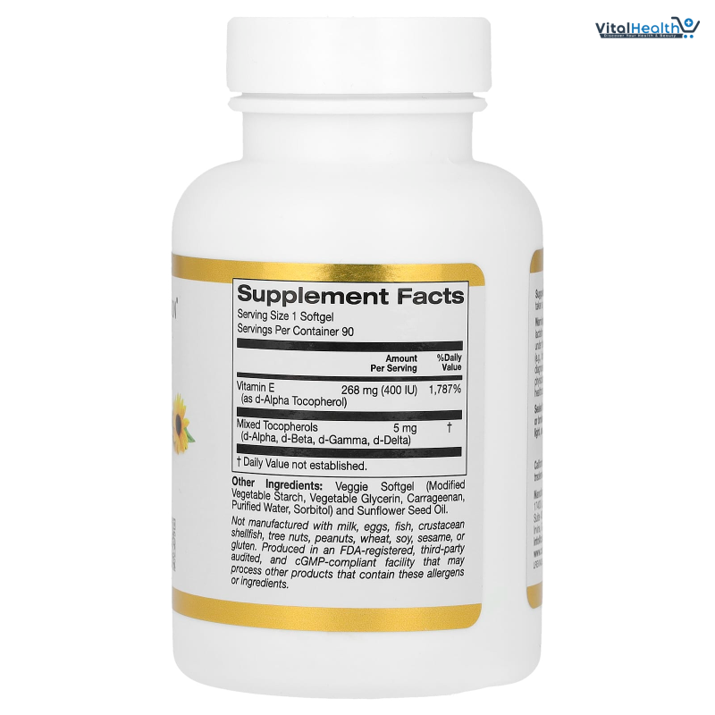 Vitamin E (as d-Alpha Tocopherol) 268mg 400 IU, Mixed Tocopherols (d-Alpha, d-Beta, d-Gamma, d-Delta) 4mg, Veggie Softgel (Non-GMO Vegetable Starch, Vegetable Glycerin, Carrageenan, Purified Water, Sorbitol) and Sunflower Seed Oil.