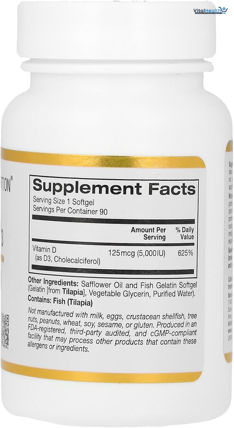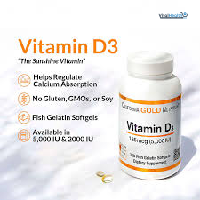 California Gold Nutrition® Vitamin D3, 125 mcg (5,000 IU) is a vitamin D supplement as cholecalciferol in fish gelatin softgels. Vitamin D3 may help support bone health by regulating the absorption of calcium and phosphorus, two minerals needed to build strong bones.