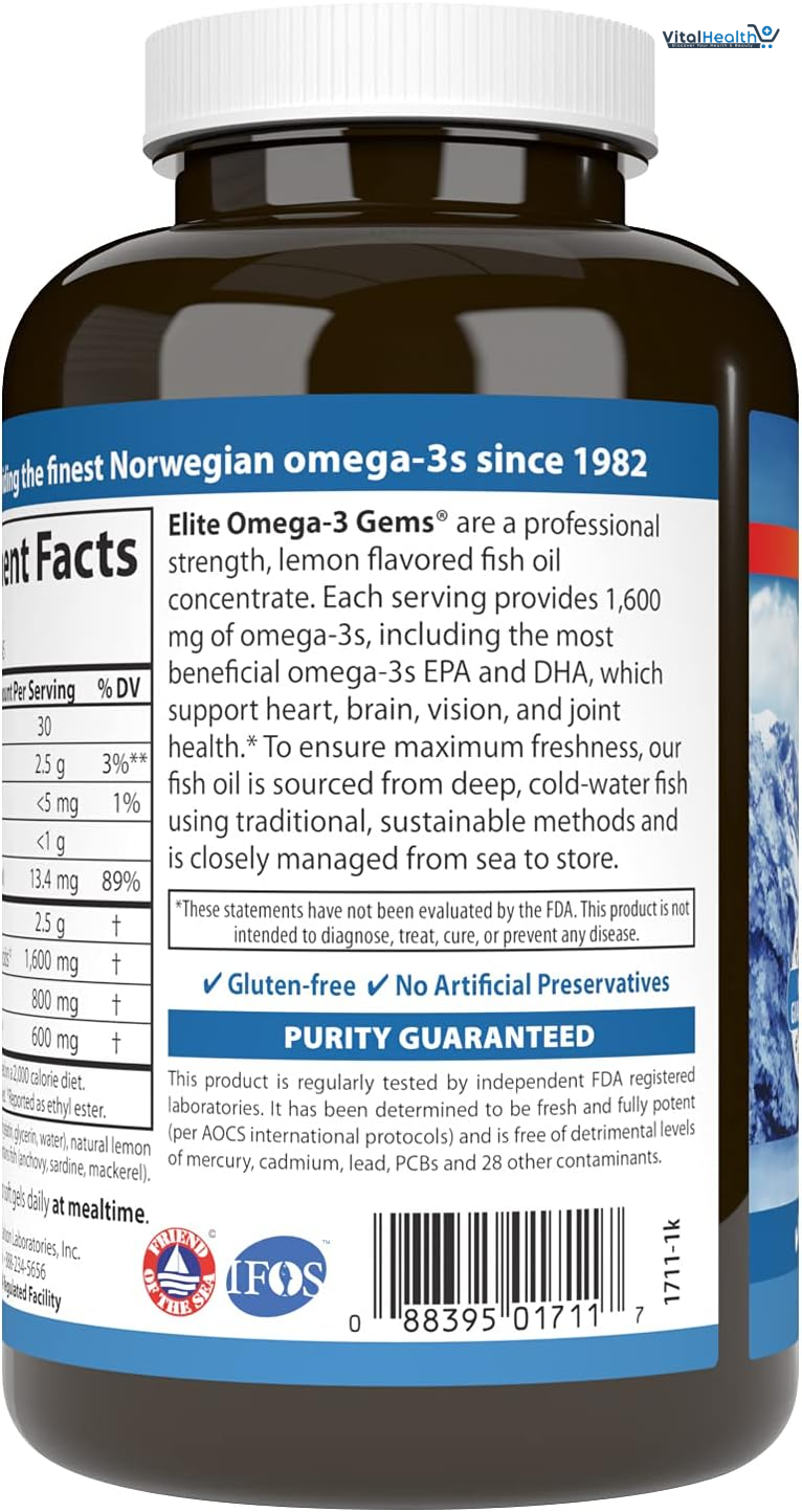 Carlson Elite Omega-3 Gems® is a professional-strength fish oil concentrate. A single serving provides 1,600 mg of omega-3s, including the important omega-3s EPA and DHA, which promote heart, brain, vision, and joint health. To ensure maximum freshness, Elite Omega-3 Gems® is closely managed from sea to store. We source the highest quality, deep, cold-water fish using traditional, sustainable methods. And like all Carlson omega-3s, they're tested by an FDA-registered laboratory for freshness, potency, and purity.