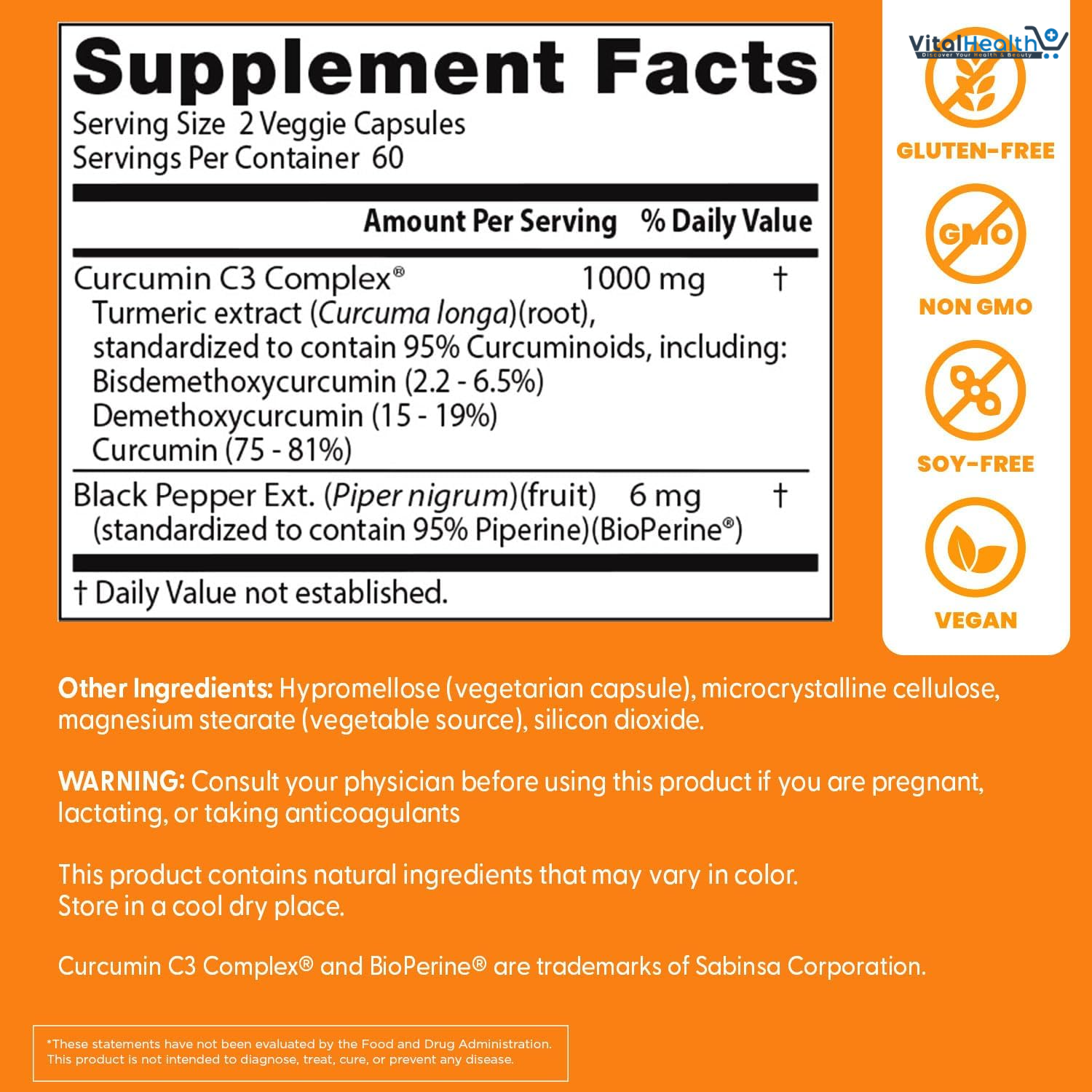 Turmeric root (Curcuma longa) (Curcumin C3 Complex) Standardized to >95% Curcuminoids Including: Bisdemethoxy Curcumin (2.2 - 6.5%) Demethoxy Curcumin (15 - 19%) Curcumin (75 - 81%) 1000 mg, Black pepper fruit extract (Piper nigrum) BioPerine 6 mg, Gelatin (capsule), microcrystalline cellulose, magnesium stearate (vegetable source).