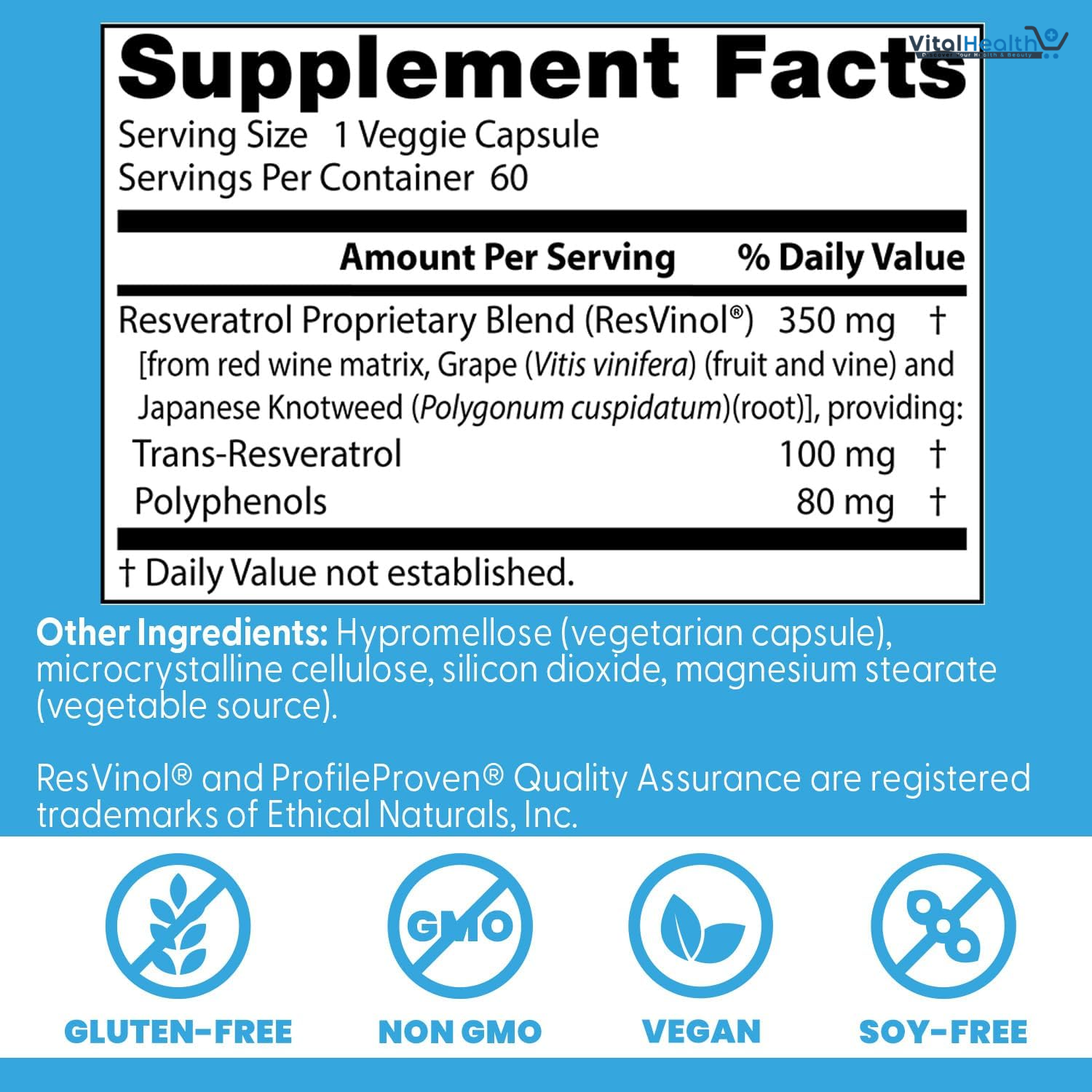 Trans-Rsveratrol 100 mg, Polyphenols 80mg (from red wine matrix (Grape(vitis vinifera)) and Japanese Knotweed (Polygonum cuspidatum)), Modfied cellulose (vegetarian capsule) rice flour, silicon dioxide, magnesium stearate (vegetable source).