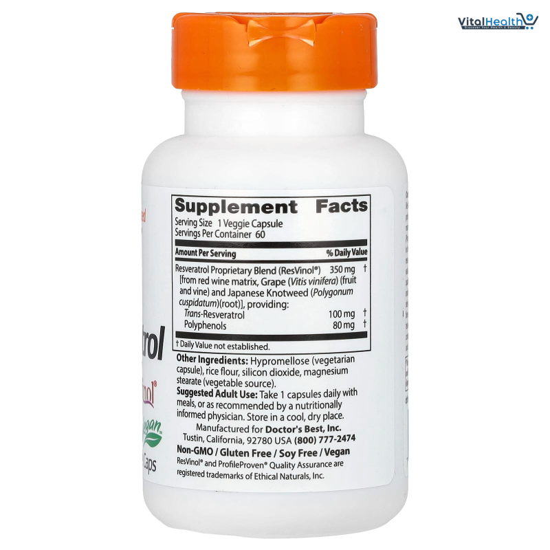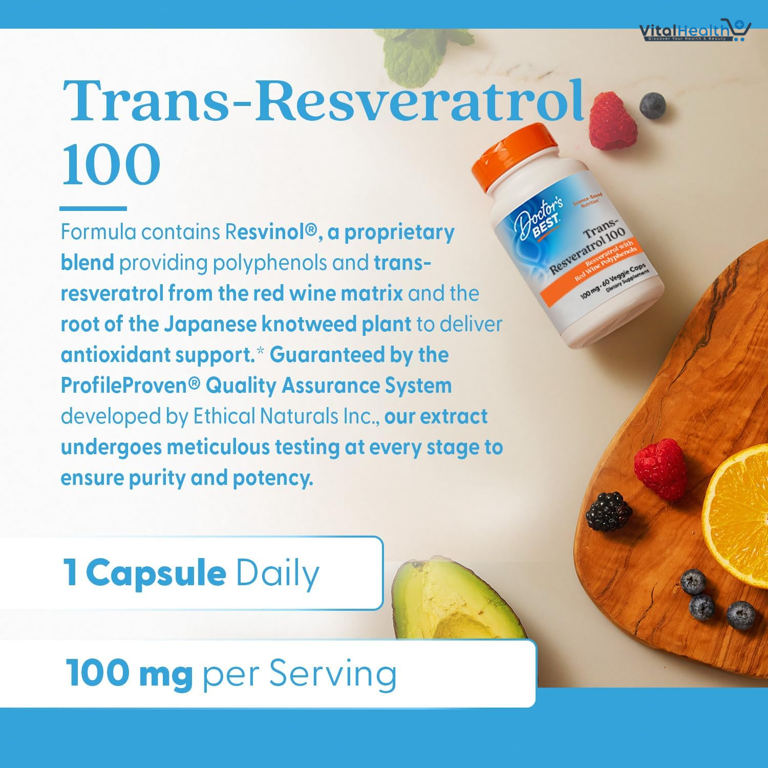 Doctor's Best Trans-resveratrol supplements, often derived from Japanese Knotweed, is powerful antioxidant capsules commonly used to support cardiovascular health, healthy aging, and cellular function. The trans isomer is preferred for higher biological activity, with common dosages ranging from 100mg to over 1000mg per serving to help improve blood pressure and metabolism.
