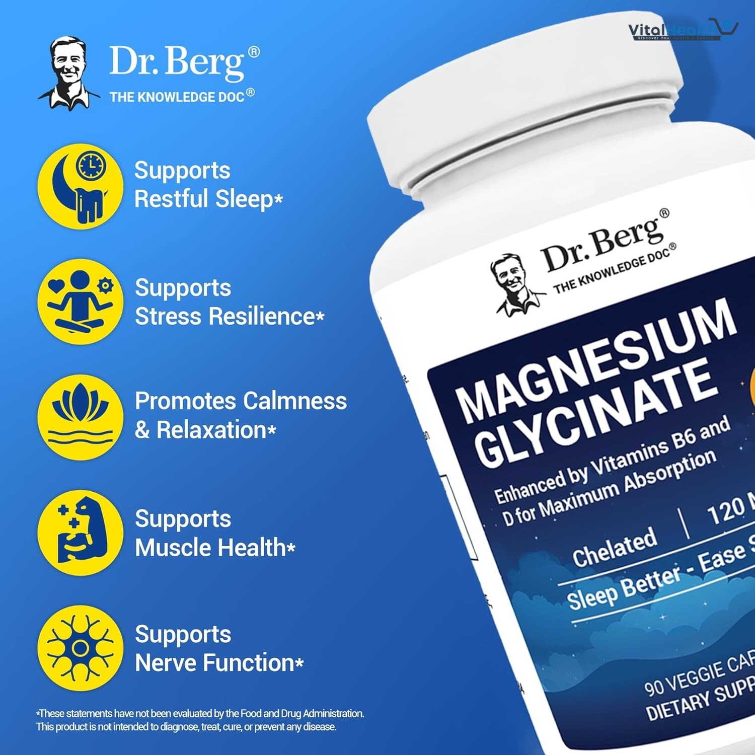 Dr. Berg Magnesium Glycinate is an exclusive combination of high-quality ingredients that provides a daily dose of essential nutrients. Each capsule delivers 120 mg of magnesium, 6.5 mg of vitamin B6, 100 IU of vitamin D3, and 10 mg of zinc.