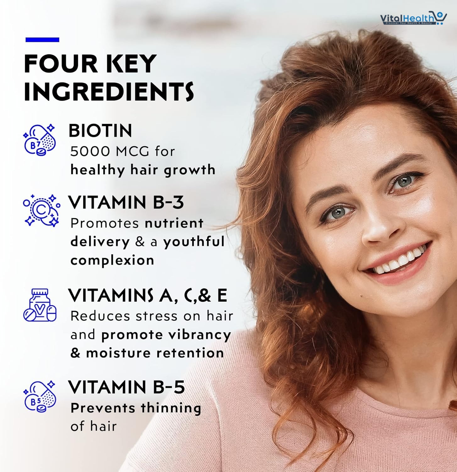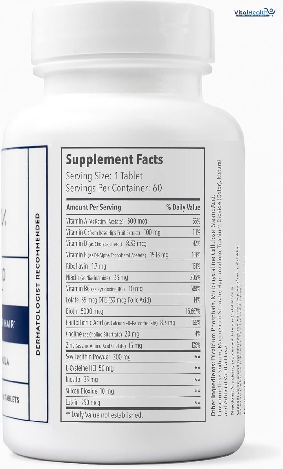 Biotin, L-Cysteine, Fish Collagen Peptides, and Silicon Dioxide Each nutrient-packed tablet combines Biotin 5,000mcg, L-Cysteine, and Silicon Dioxide, Vitamin C, Vitamin A, Vitamin E, Folic Acid, and Pantothenic Acid 5000 mcg of Biotin with L-cysteine ​​and Silicon Dioxide. 3000 Mcg Biotin with L-Cysteine ​​and Silicon Dioxide Biotin, Vitamin A, Vitamin D, Vitamin E, Vitamin B12, Folate Saw Palmetto, Biotin, Vitamin B6, Folate, Horsetail Extract, Zinc, and Copper