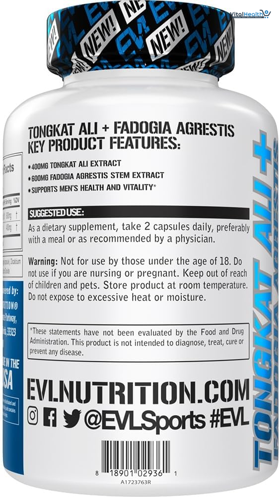 Take your workouts to the max with our Fadogia Agrestis and Tongkat Ali supplement and get more out of each workout with increased power and endurance muscle growth and performance Quality Ingredients This vegan and gluten free supplement contains 400mg of Tongkat Ali and 600mg of Fadogia Agrestis Stem Extract As a dietary supplement take 2 capsules daily preferably with a meal or as recommended by a physician Why EVL EVL is a leading name in full stack supplements because we take our quality seriously and only use the finest lab tested performance maximizing ingredients