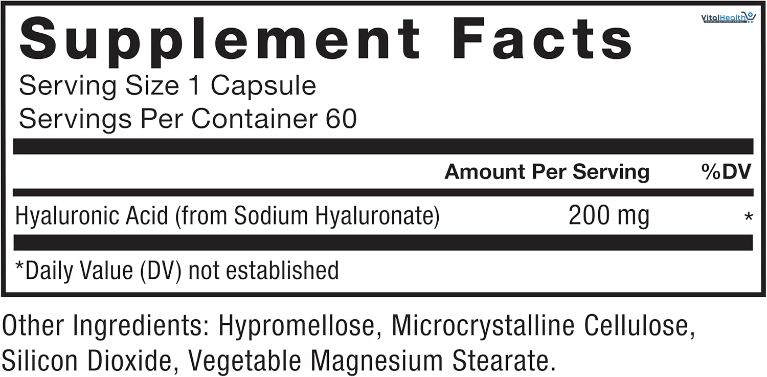 Hyaluronic Acid (from Sodium Hyaluronate), Hypromellose, Microcrystalline Cellulose, Silicon Dioxide, Vegetable Magnesium Stearate.